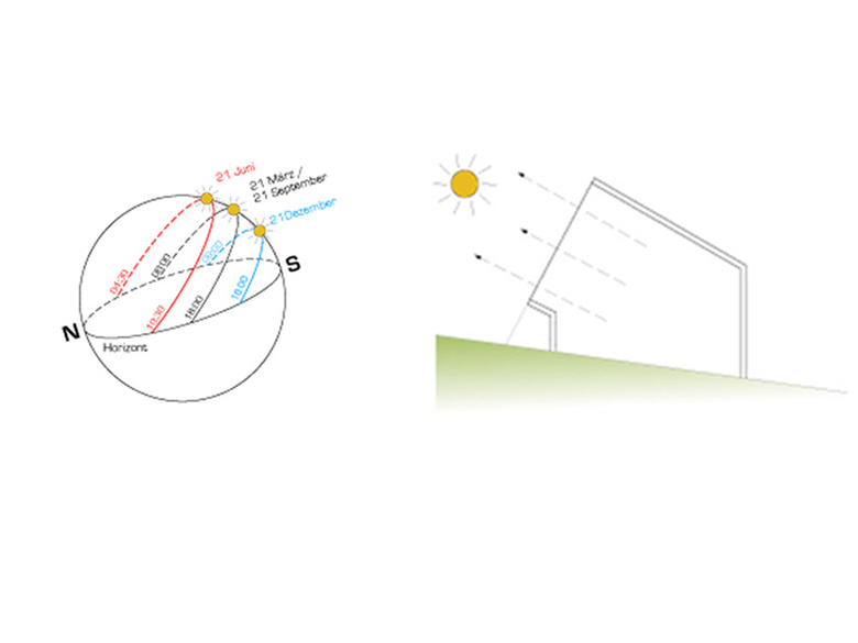 Nebst der ortsbaulichen Konzeption, basiert die grundlegende Projektidee auf einer Maximierung der solaren Gewinne. Um dies zu erreichen sind die südlichen Dachflächen /Fassaden auf den Sonnenstand des Winterhalbjahres ausgerichtet. Die Decken sind so zurückgestaffelt, damit die winterliche Sonne (Tiefstand 21. Dez.: 18°) möglichst tief in den Baukörper einfallen kann, um so die höchst möglichen solaren Gewinne zu erzielen. Damit sich der Baukörper im Sommerhalbjahr (Equinox 21. März bis 21.Sept.: 43°) nicht aufheizt, ist die Deckengeometrie so ausgebildet, dass die Mittagssonne vom Frühling bis Herbst nicht mehr in den Raum eintreffen kann und somit der Raum nicht unnötig aufgeheizt wird.