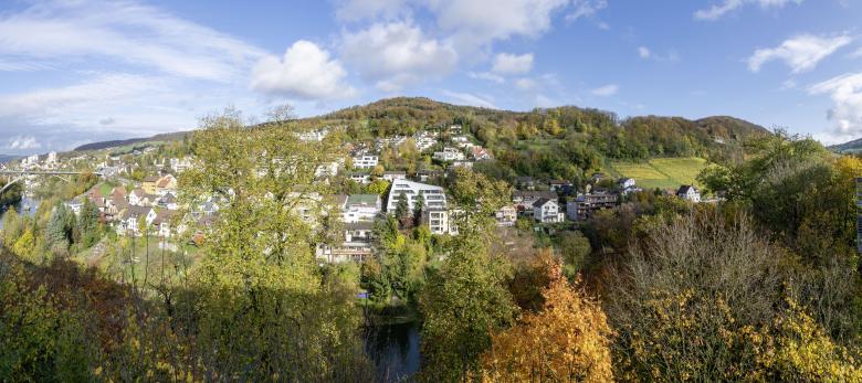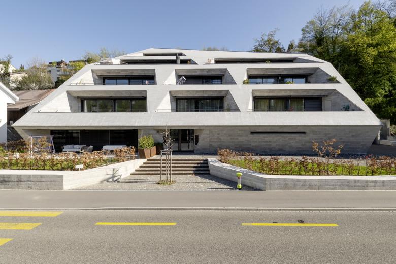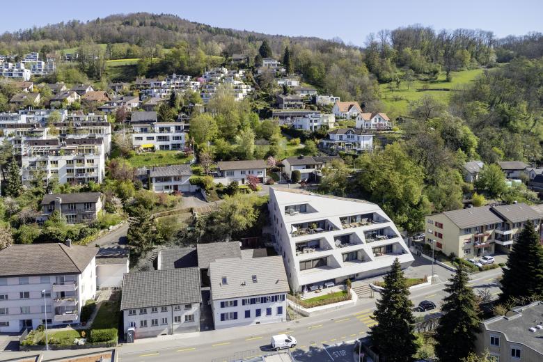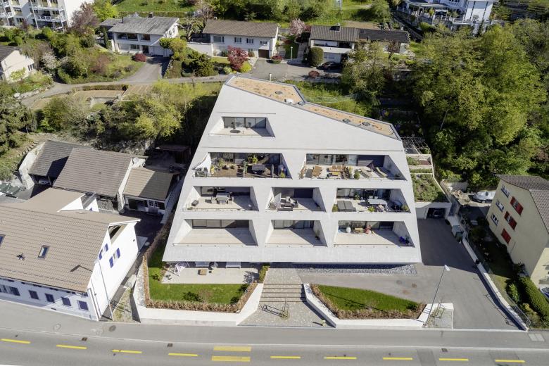 Die terrassierte Topografie unterhalb des Waldstreifens entlang der östlichen Parzellengrenze bleibt erhalten und wird für den gemeinschaftlichen Gebrauch in Stand gestellt. Insgesamt soll der „Grünanteil“ der neuen Anlage gegenüber der heutigen Situation vergrössert werden. Die nach Osten geneigte Dachfläche soll mit Extensiv- Substrat begrünt werden. Dem entsprechend soll auch die Farbigkeit des Fassadenmaterials im Einklang zum Baumbestand und zu einem überwiegenden Grünanteil stehen.