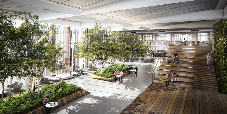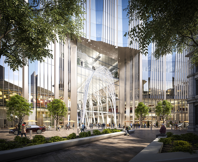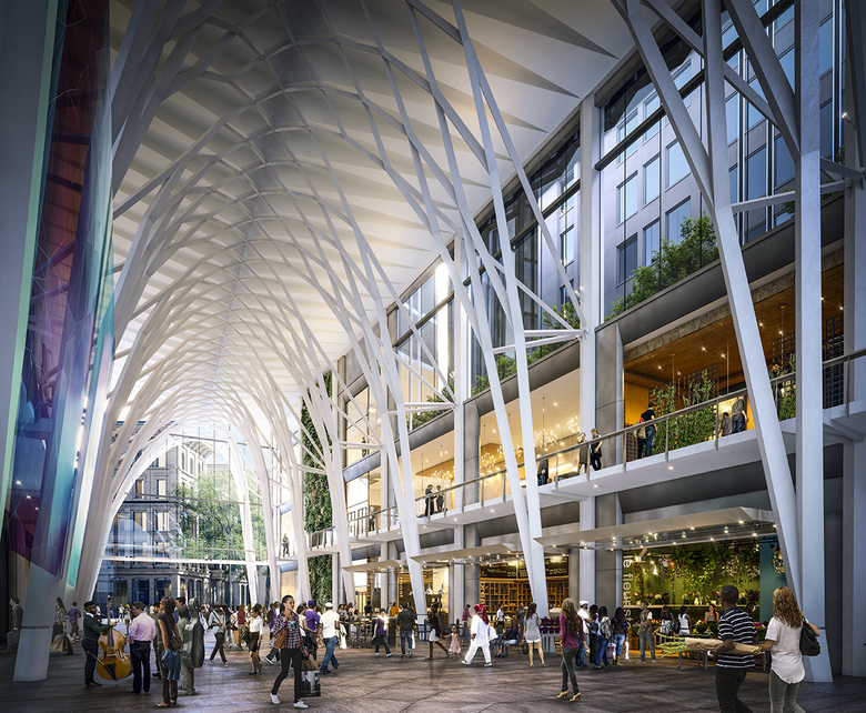 At the base of the building will be “The Great Hall” - a distinctive gathering place active through all seasons and a focal point for activity from morning into the evening. This new “urban room” of shape and size is intended to be inherently civic in scale and function. It is a public connector, a celebratory arcade conceived as a signature space finished with warm stone paving, shimmering metal panels and transparent glazing. Framing the 65-foot high volume is perhaps the most dramatic element: a lattice of soaring steel arches that shape the space and draw the eye up to an angular, vaulted ceiling. Extending from Winthrop Square through the building to Federal Street, the vaults define the layers of space between the central hall and the “aisles,” similar to a traditional galleria found in Milan or London.
