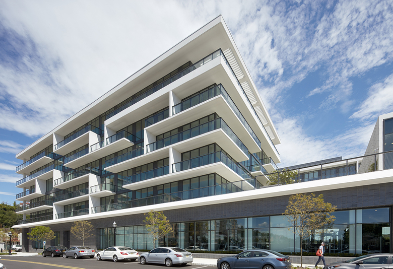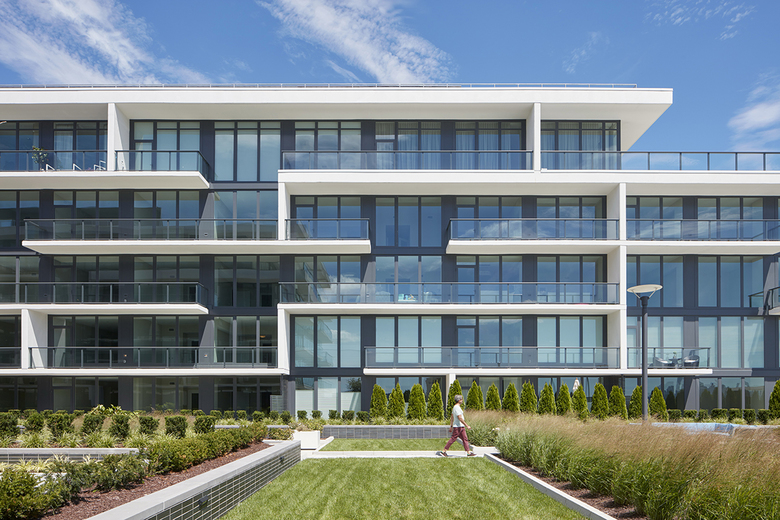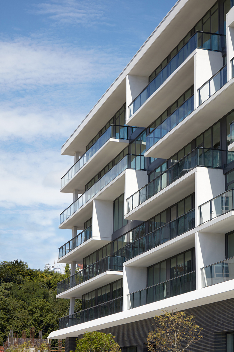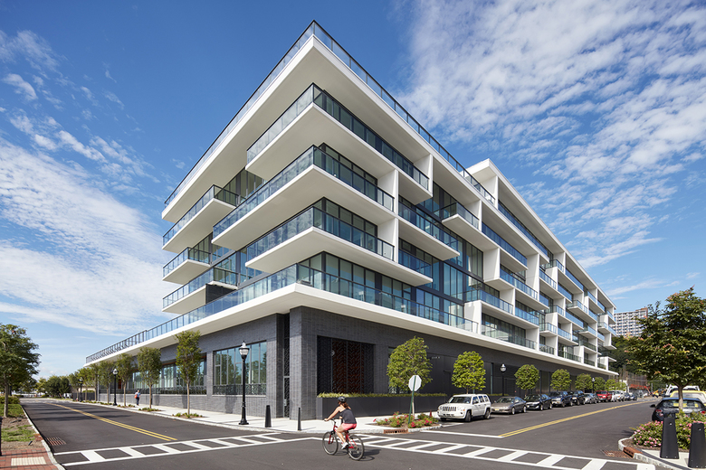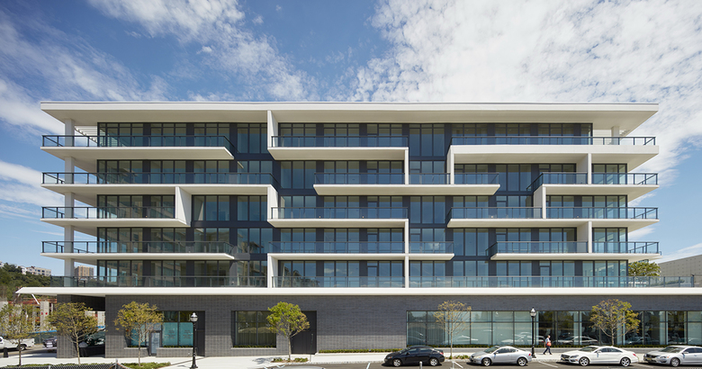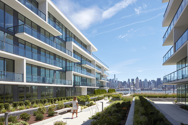 Directly across the Hudson River from Midtown Manhattan, 1200 Avenue is a 103-unit condo building, part of a collection of buildings nestled below the Palisades with amazing views and easy access to New York City. The building is defined by a rhythm of balconies that are connected in a shifting progression of right angles set against floor-to-ceiling glass. This abstract pattern creates double height spaces in the balconies, and gives the feeling of unobstructed openness to the sky and river, while also allowing natural light to penetrate deeper into the interior of the units.