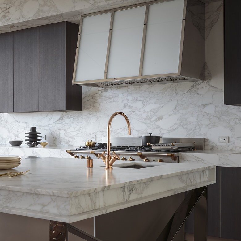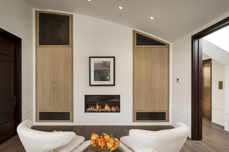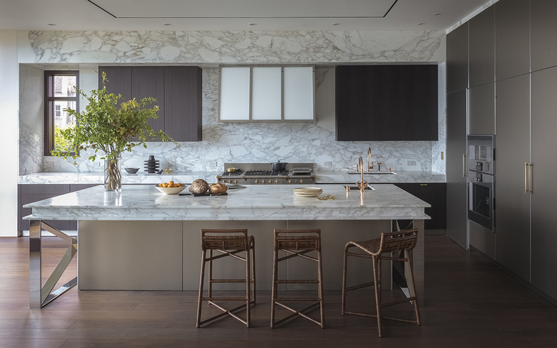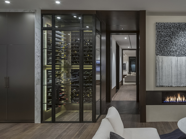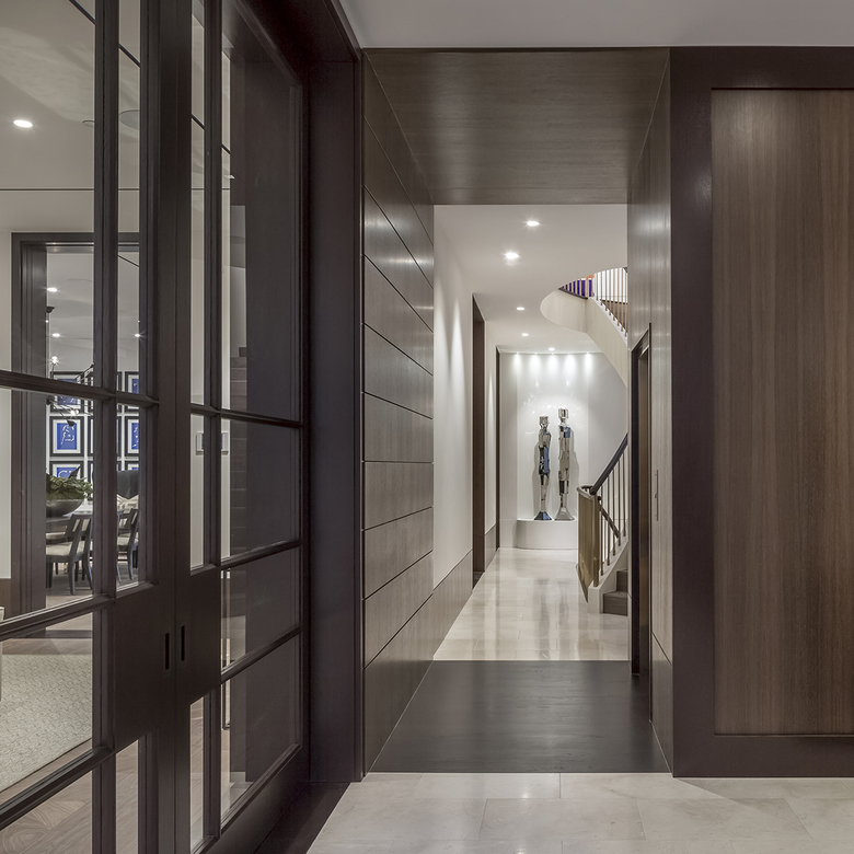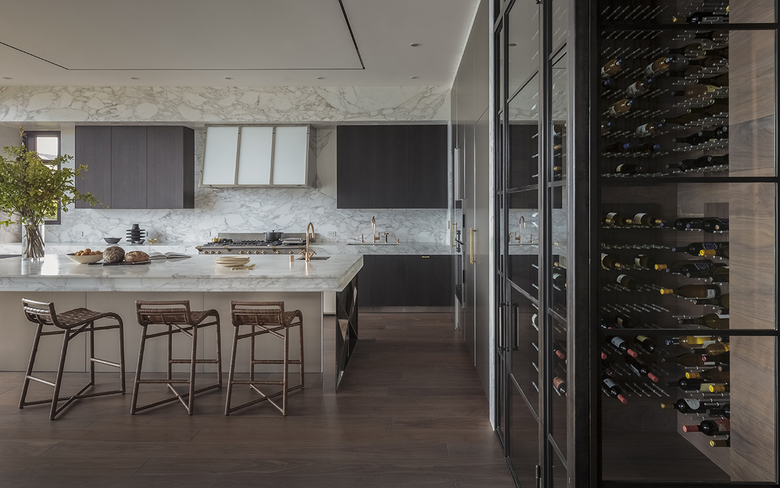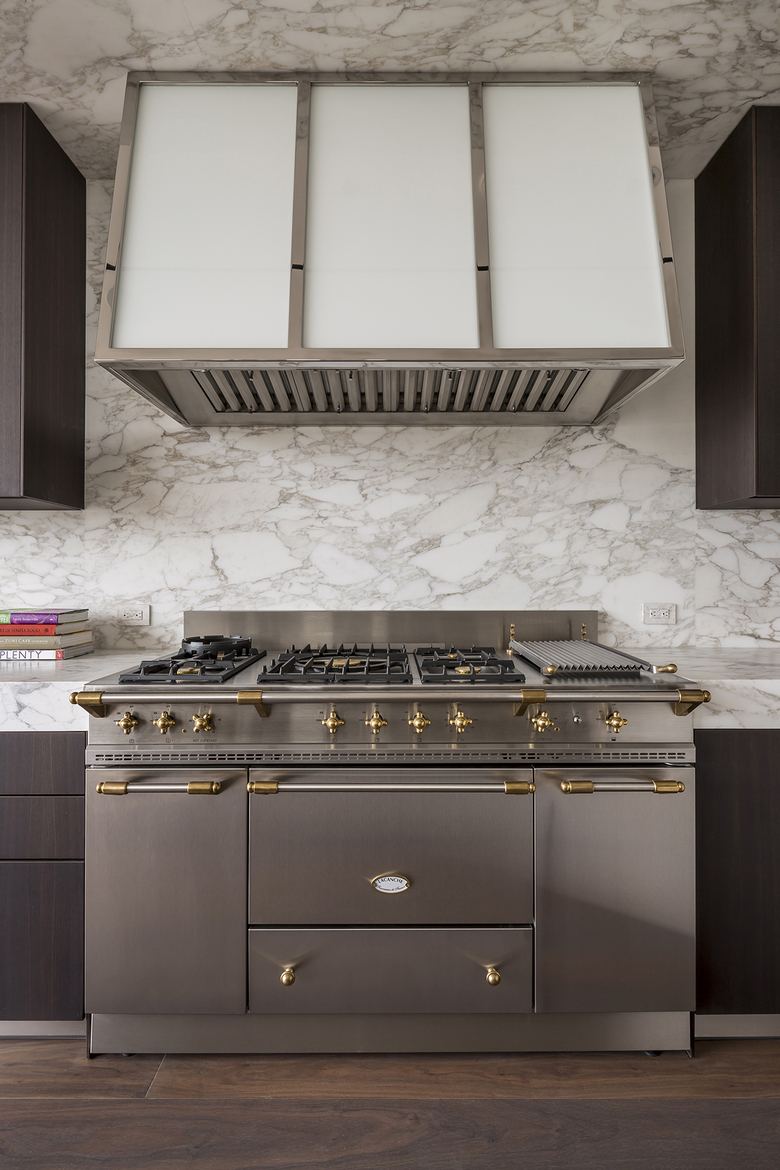 Handel Interiors created a state-of-the-art home with spaces that are timeless, warm and transitional. Ten-foot-high oak, three-panel doors, brushed limestone, Italian marble, and bronze hardware offset Fantini and Dornbracht fixtures. A Lacanche range, hand-built in France, adds unexpected flair to the sleek Bulthaup kitchen.