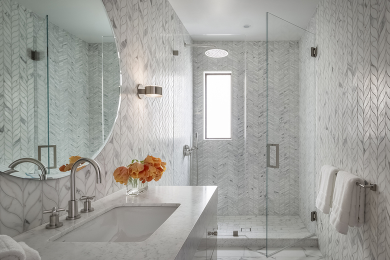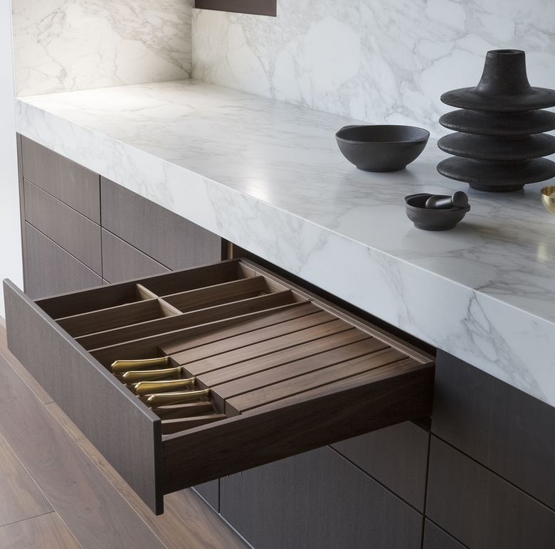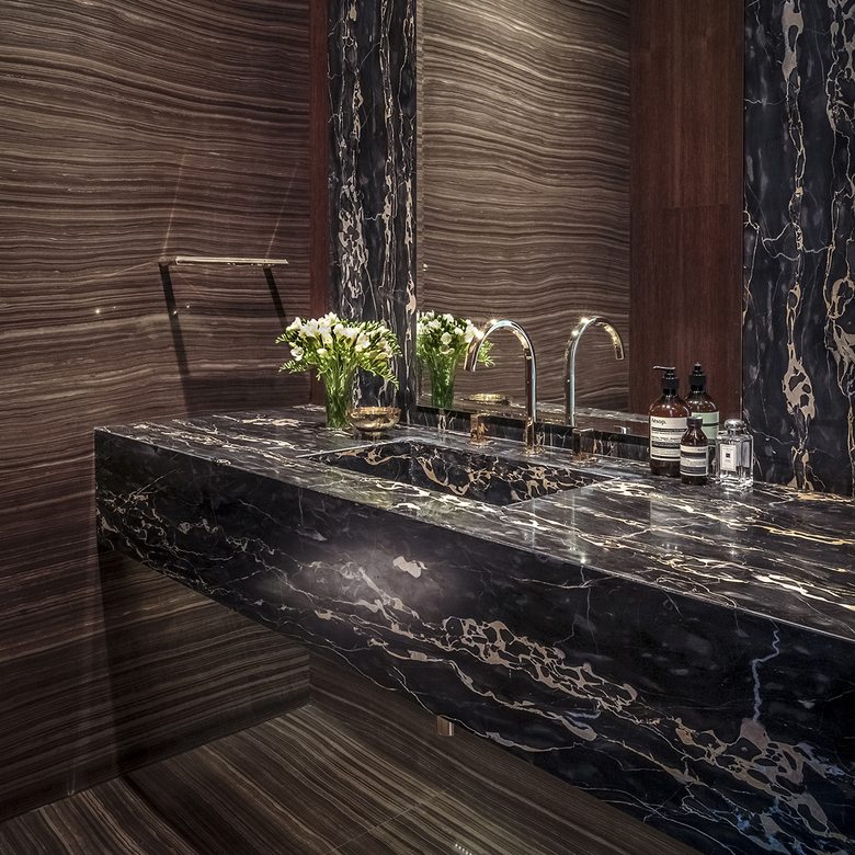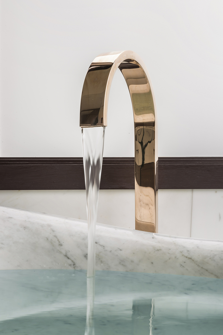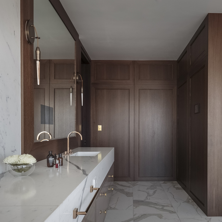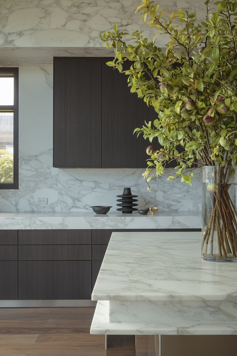 Handel Interiors created a state-of-the-art home with spaces that are timeless, warm and transitional. Ten-foot-high oak, three-panel doors, brushed limestone, Italian marble, and bronze hardware offset Fantini and Dornbracht fixtures. A Lacanche range, hand-built in France, adds unexpected flair to the sleek Bulthaup kitchen.