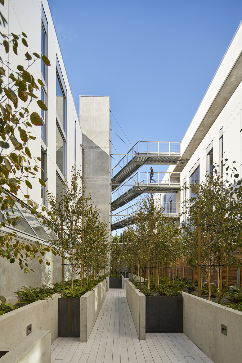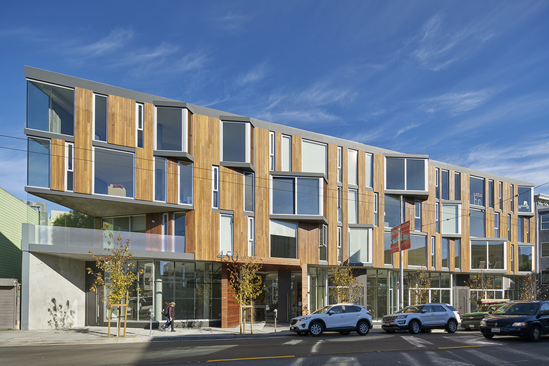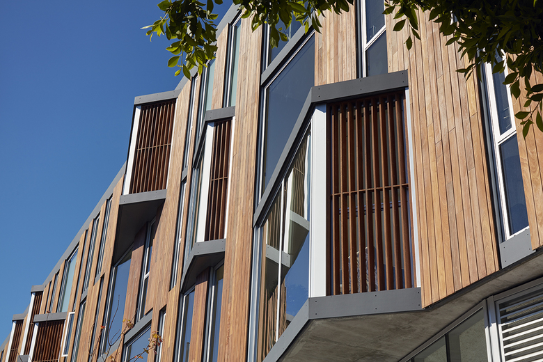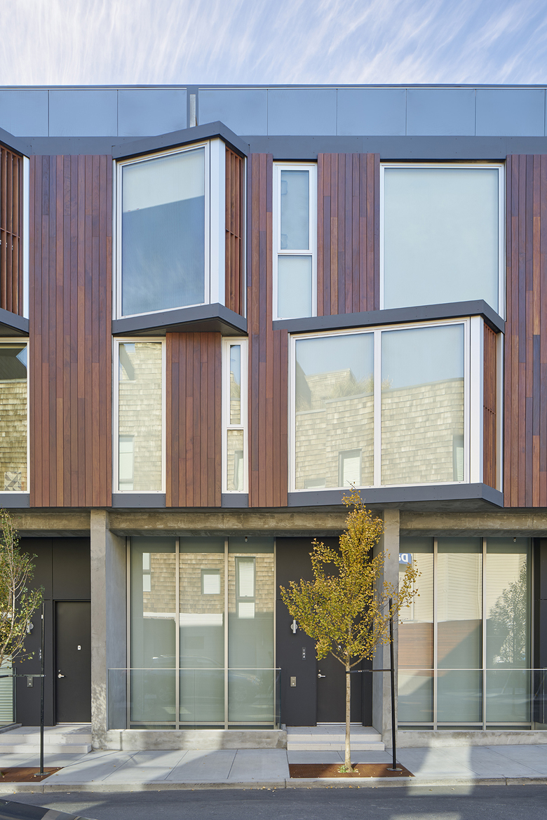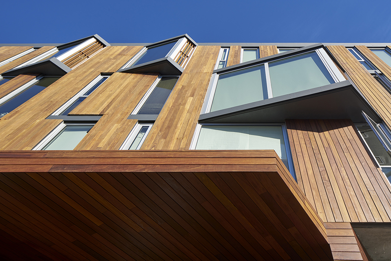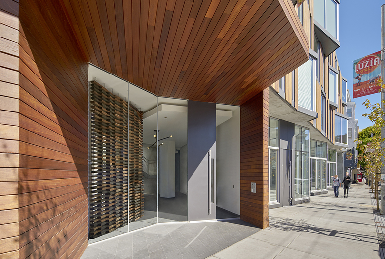 Both buildings are defined by a pattern of wood panels, made from a Brazilian Hardwood called Ipe, that create a kinetic rhythm along the street. Scattered bay windows angled down Hayes Street provide panoramic views of Patricia's Green, an urban park with rotating art exhibits. A birch grove in the project's interior courtyard creates a shady retreat for the building's residents, and loft homes on Ivy Street offer unique sunken living spaces with soaring ceilings and private gardens.