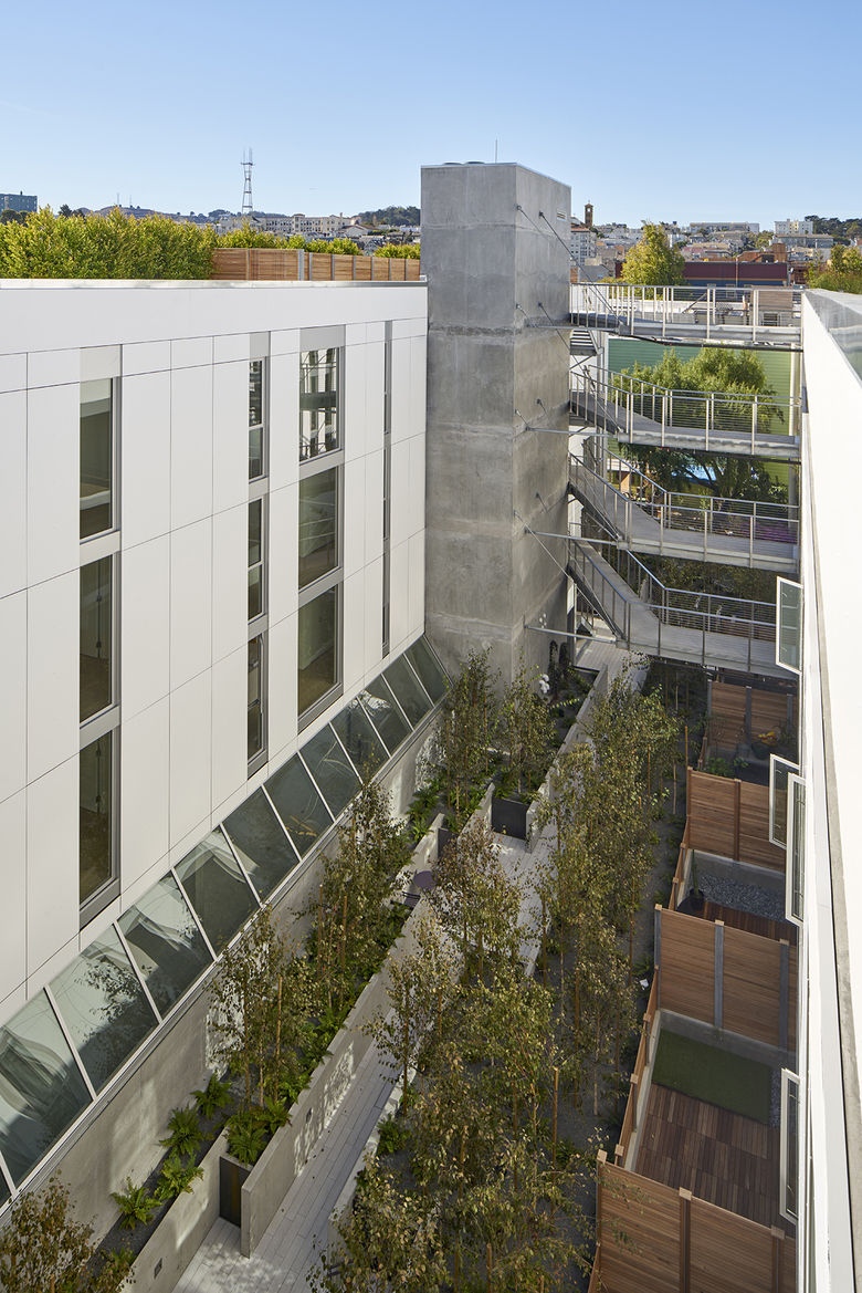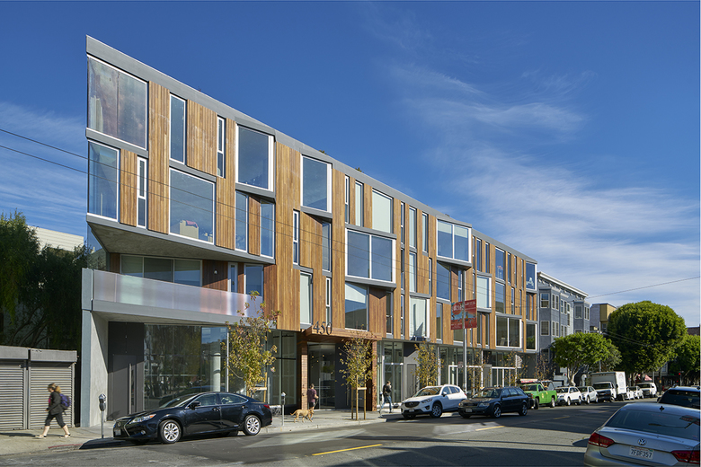 450 Hayes is a new low-rise residential building located in the heart of the vibrant Hayes Valley neighborhood in San Francisco. The irregularly shaped building site was a result of the construction, and subsequent demolition, of the Central Freeway which previously cut through the area. The resultant project is actually two buildings, connected by an internal courtyard that runs the east-west width of the site with bridges connecting the two structures. The north-facing building fronts Ivy Street, while the south facing one fronts Hayes Street. There are 41 residential units in total, with ground floor retail on Hayes Street.