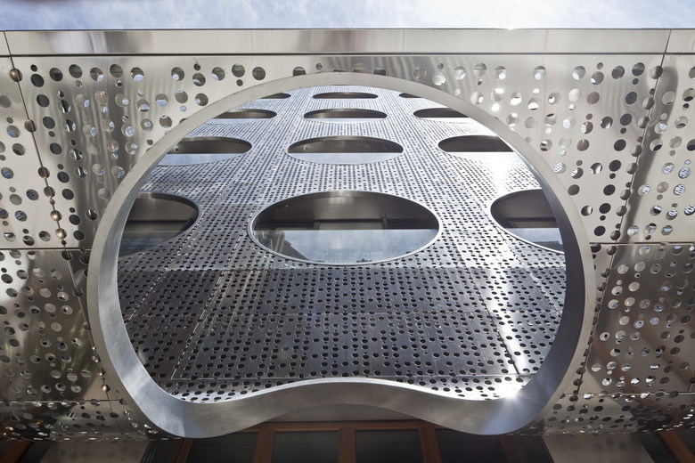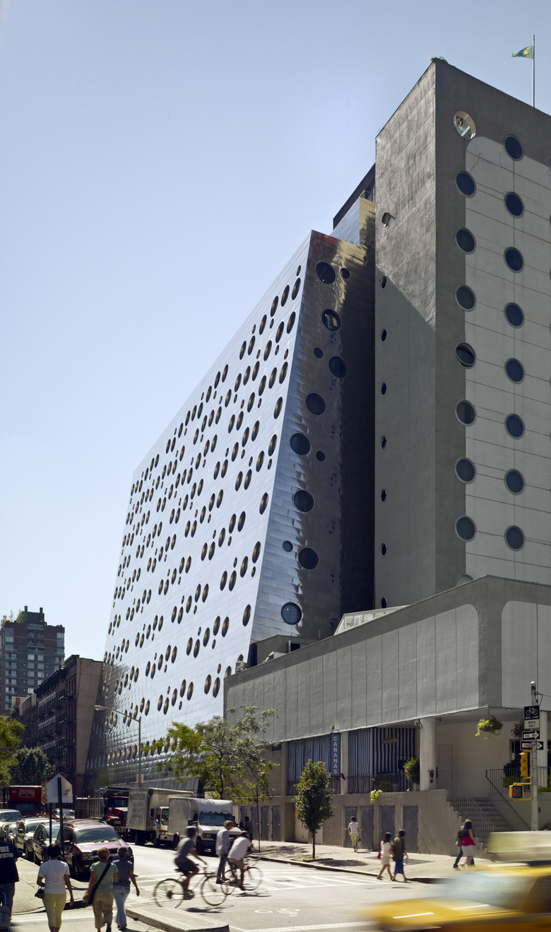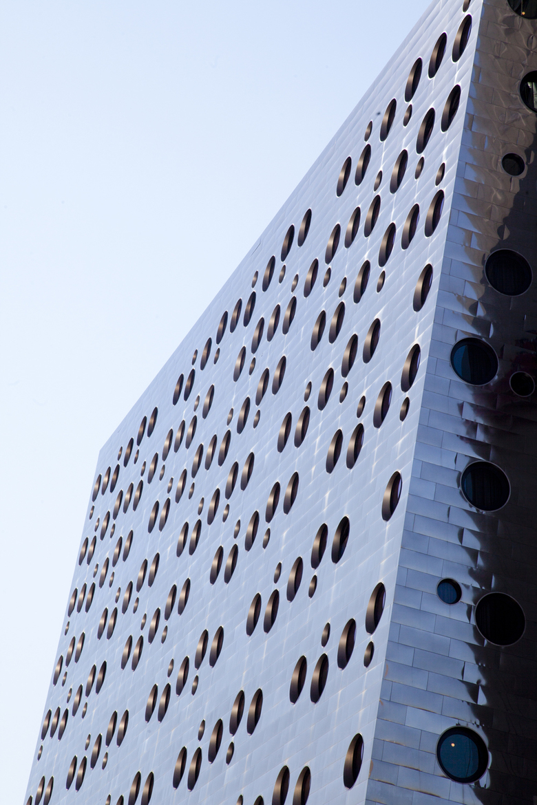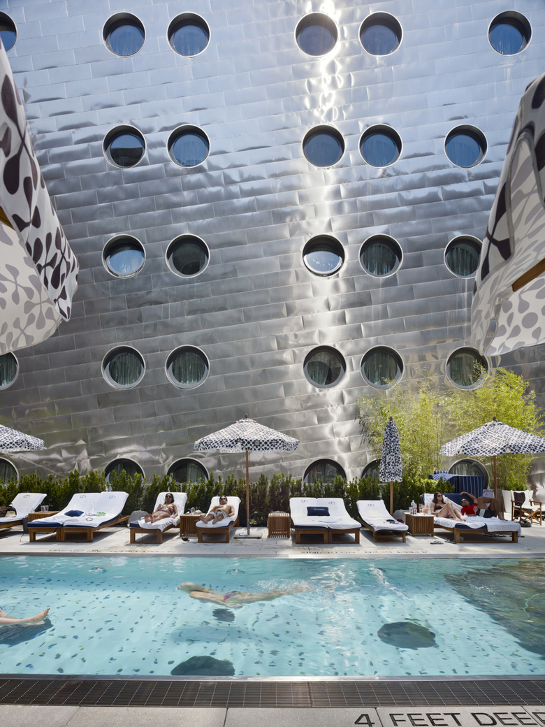 Originally designed for the Maritime Union in 1966, the building was converted into a hotel, which created design opportunities as well as constraints. The original façade was punched with porthole windows to express the maritime program, and these were kept and expanded upon. The portholes became central to the design and the surreal quality they create. The original through block building offered limited possibilities for natural light, so four floors were removed from the center of the building, which created a new pool terrace and beach, new windows and balconies for guestrooms, along with two new floors of guestrooms on the southern portion of the building. To the north, a glass enclosed roof-top lounge and terrace was created. The glass bottom pool, dotted with portholes of its own, allows guests in the lobby glimpses through the water to the outside (and vice versa), and connects the spaces in an ethereal way. Light wells framed in teak between the lobby, pool and lower levels allow the guest to be transported between spaces. Two hundred hand blown glass globes float through the lobby and congregate over The Marble Lane restaurant filling the space with a light cloud.