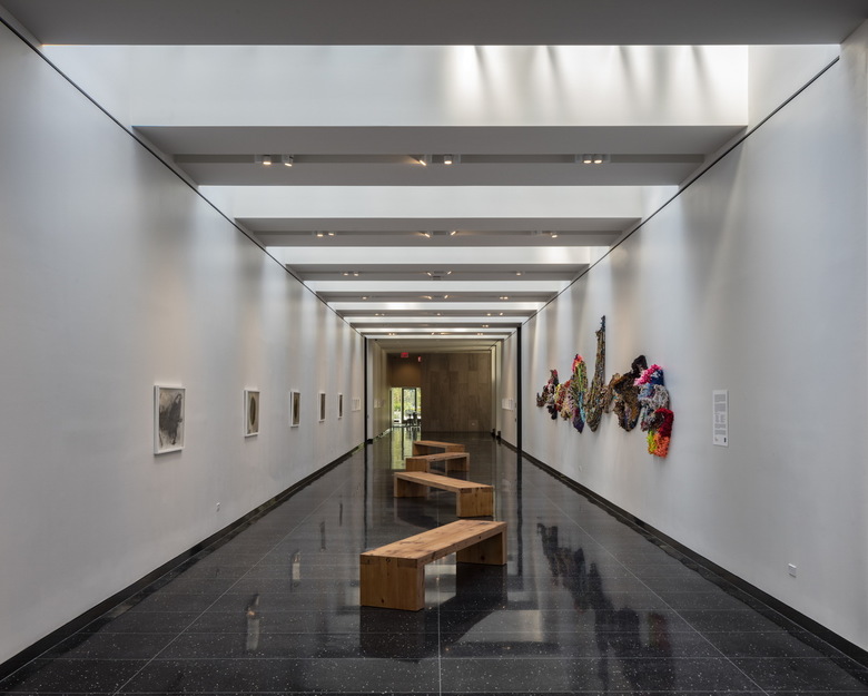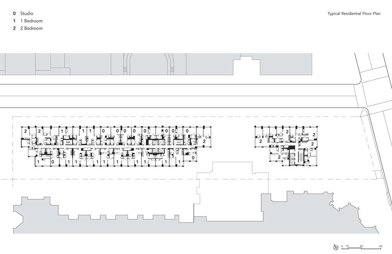 Inside, the entrance lobby connects the eastern and western portions of the building by way of a sky-lit gallery below the new transept stairs. The gallery and amenity spaces open to an outdoor terrace overlooking the park. The building interiors follow the material expression of the exterior and contain 430 apartment homes.