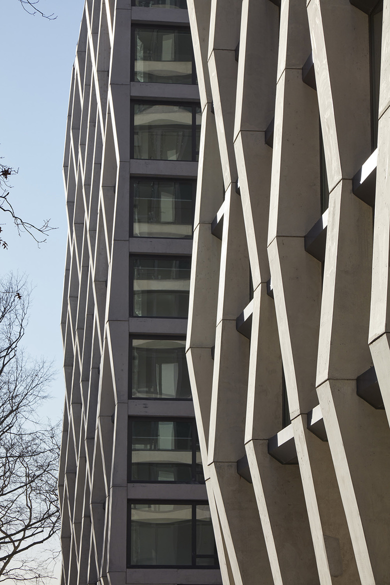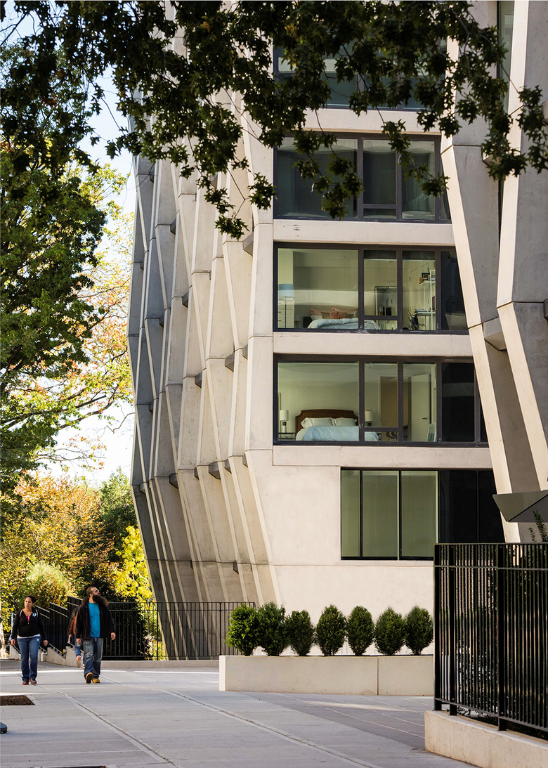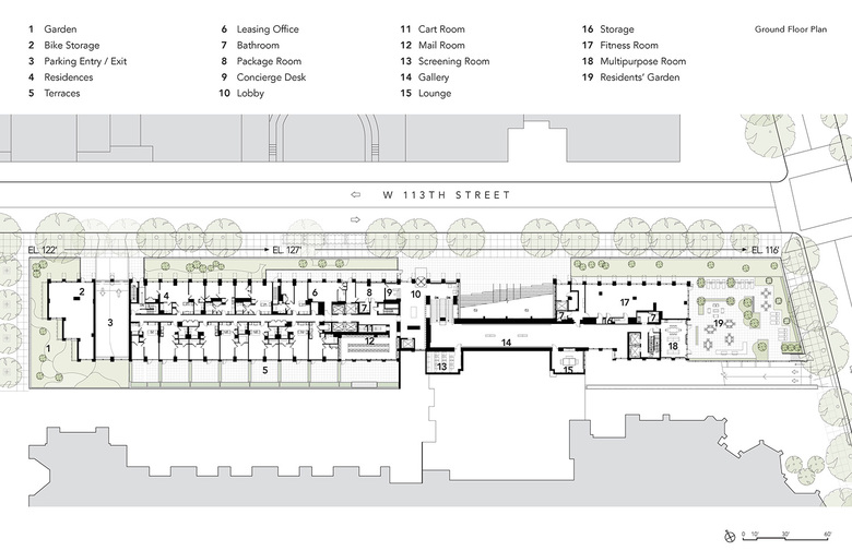 The Enclave’s façade is composed of a series of different shaped cast-in-place structural concrete ribs, derived from the transformation of the Cathedral’s buttresses. The depth of the ribs varies along West 113th Street, creating an articulated façade that changes as one moves around the building. When viewed obliquely, the ribs obscure the glazing and unify as a building face. At the top of the building, the concrete ribs taper and separate from the glass façade, mimicking the Cathedral’s buttresses. At the bottom, this same tapering increases the size of the landscape border.