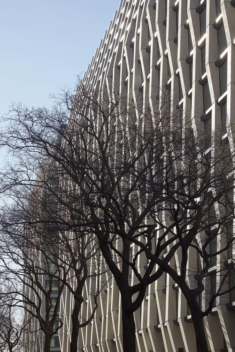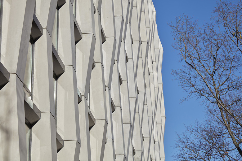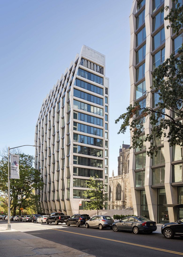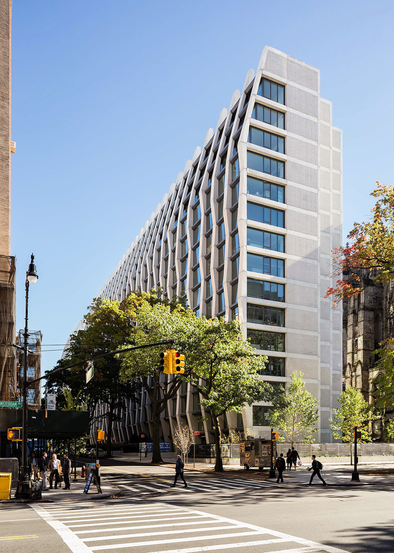 The hand-chiseled concrete of the stepped Amsterdam Avenue façade recalls the work that once took place on the site and presents a quiet deferential expression to the Cathedral. Along Morningside Drive, the solidity of the building disappears, and becomes an abstract form of glass, contained within a delicate concrete frame.