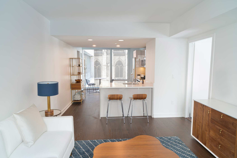 In response, Enclave is set back on all sides, providing a continuous border of landscape and an extension of the Cathedral campus to the street edge. The building is stepped to open views of the Cathedral’s North Tower at Amsterdam Avenue, and a new landscaped plaza is created at the intersection of West 113th Street. The fifteen-story building is separated into two volumes along its 113th Street frontage, opening views of the Cathedral’s Transept, and a new grand stair provides access to the Cathedral’s nave. The carving of the building’s corners and setbacks allows multiple interior views of the Cathedral, as well as to Morningside Park to the northeast.