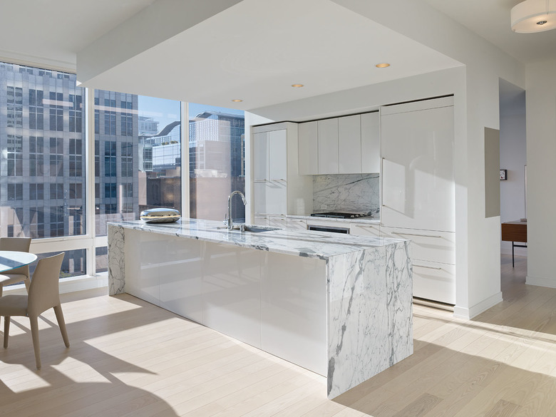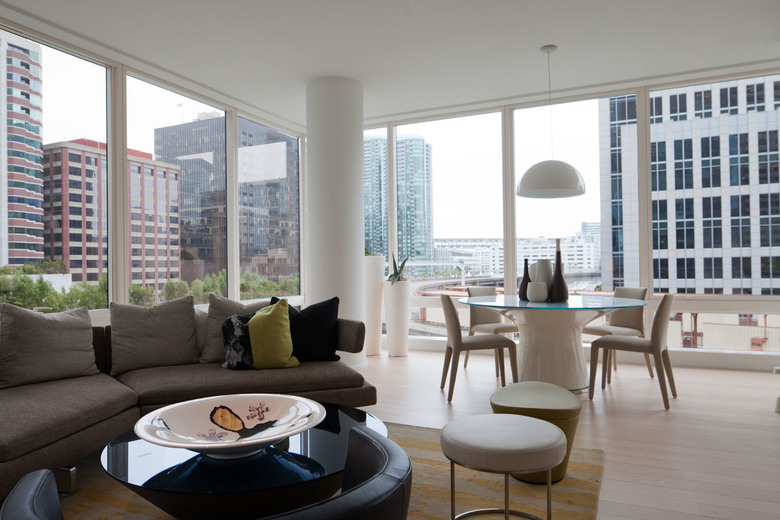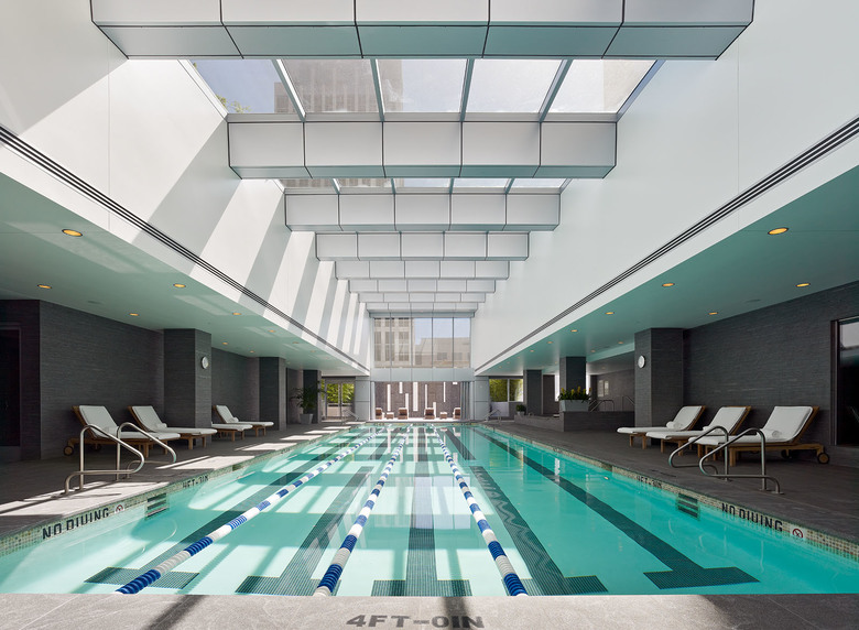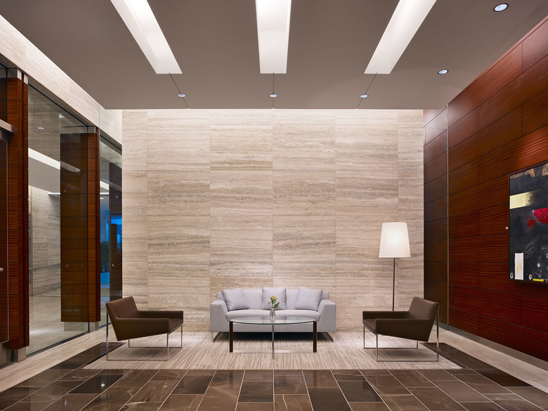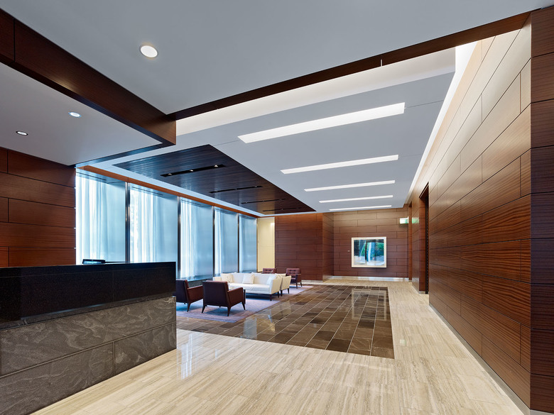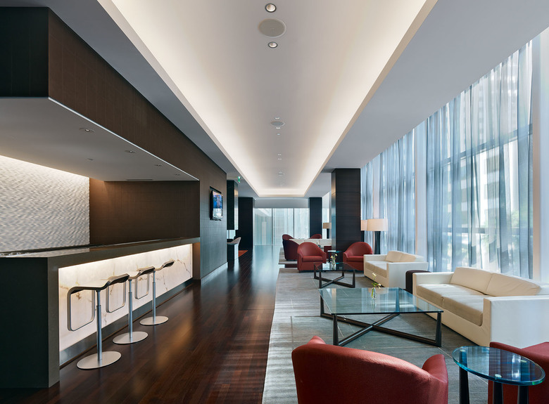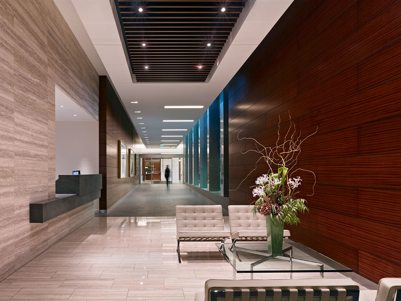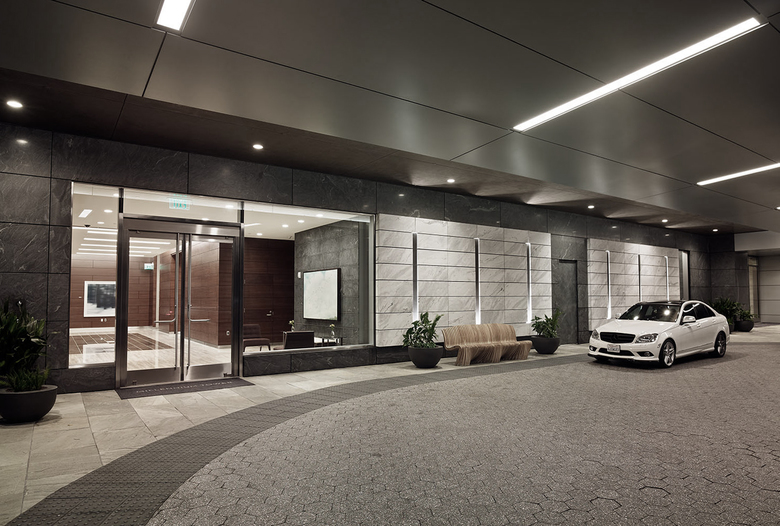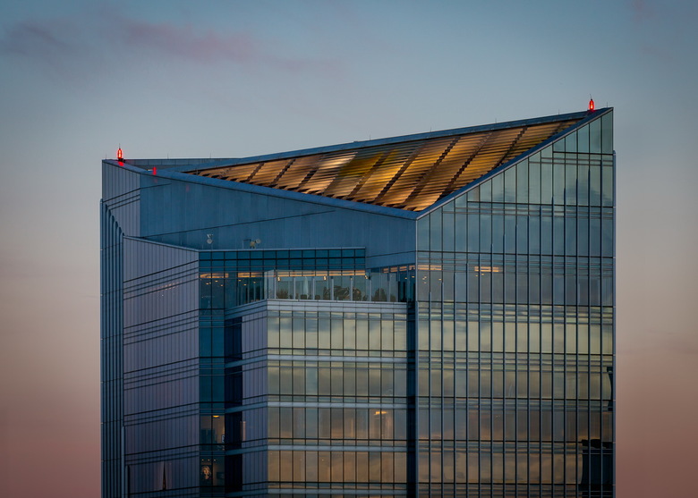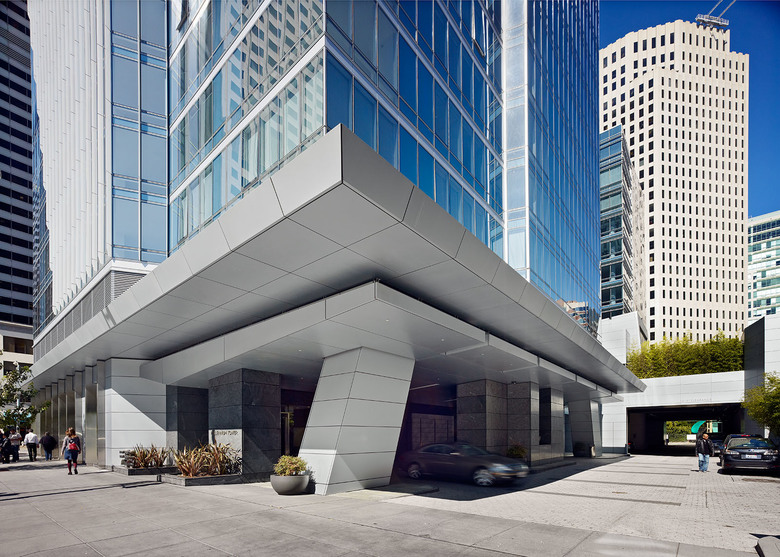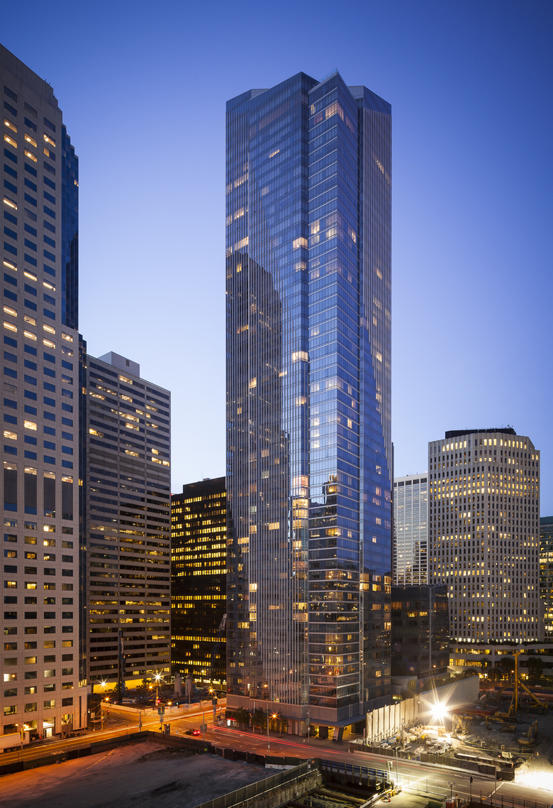 At 645 feet, the tower is the fourth-tallest structure on the city's skyline. The exterior is designed to create the impression of a translucent crystal, with materials that incorporate a variety of glass and metal fins to craft a sense of lightness and transparency. The tower's slender proportions, combined with clean lines and a sleek profile, visually reinforce the elegance of the crystalline character. The exterior profile has been sculpted with chamfered corners and faceted planes creating a perception that the building’s silhouette shifts as the light changes throughout the day.