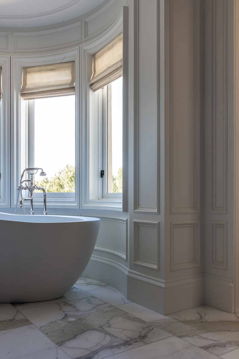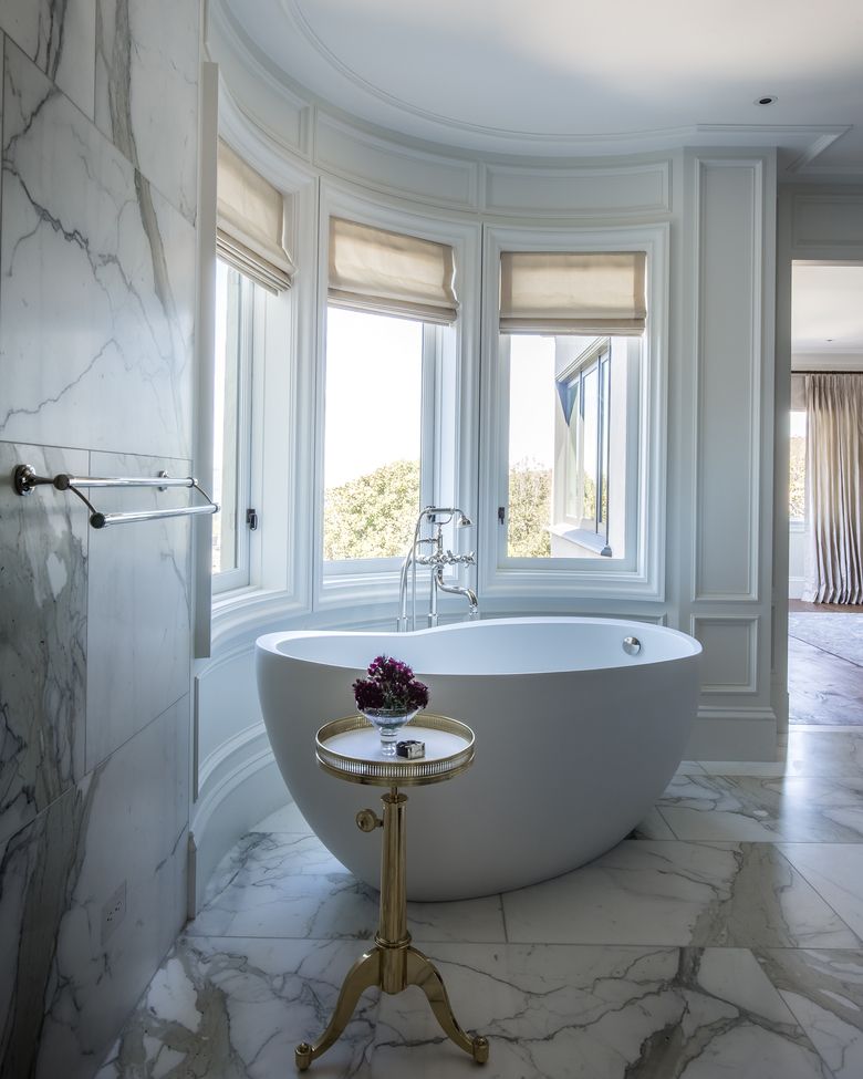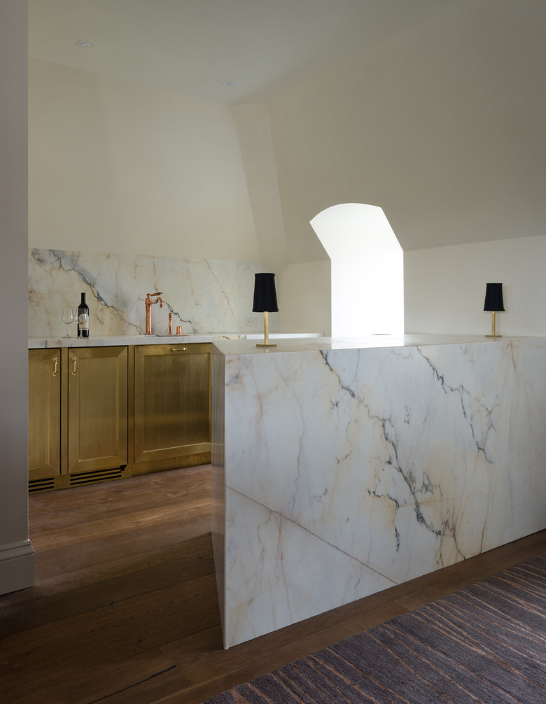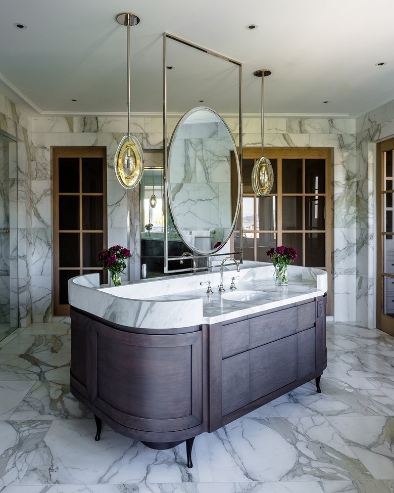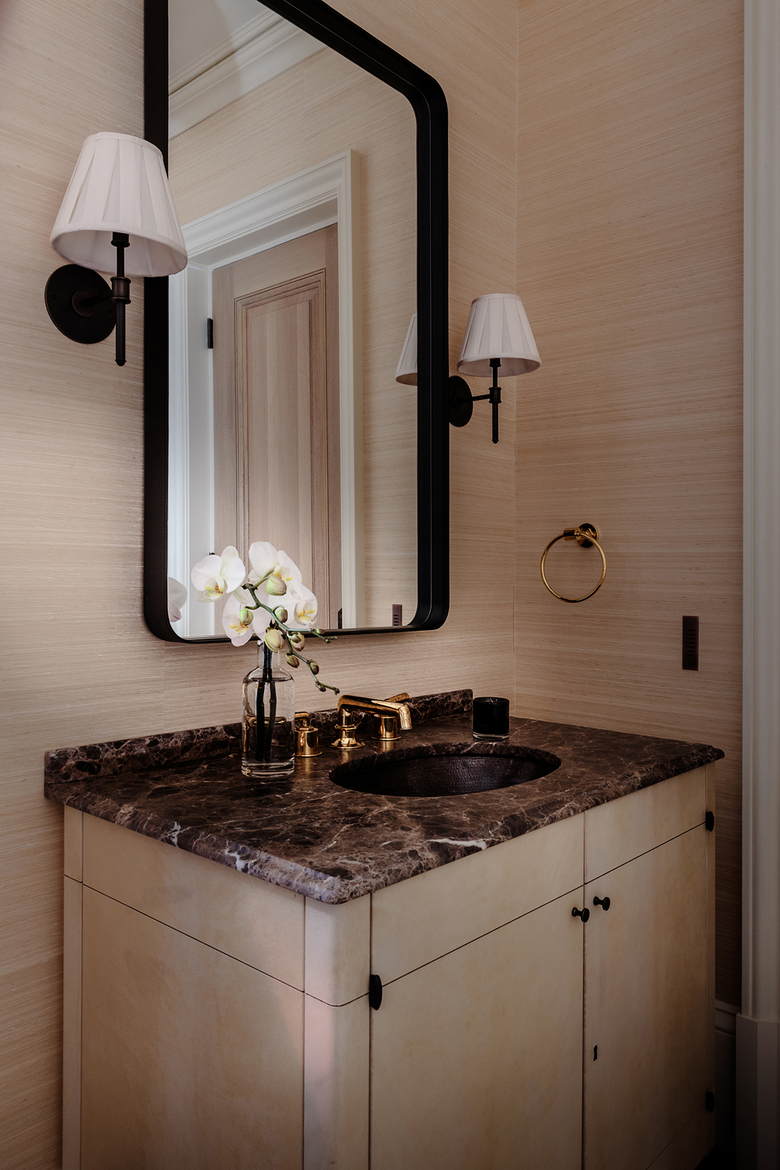 Christopher Peacock worked closely with Handel Interiors to create a breathtaking kitchen of painted cabinetry accented with walnut and brass. Fixtures and fittings from Waterworks and Dornbracht grace the six bathrooms and four powders.