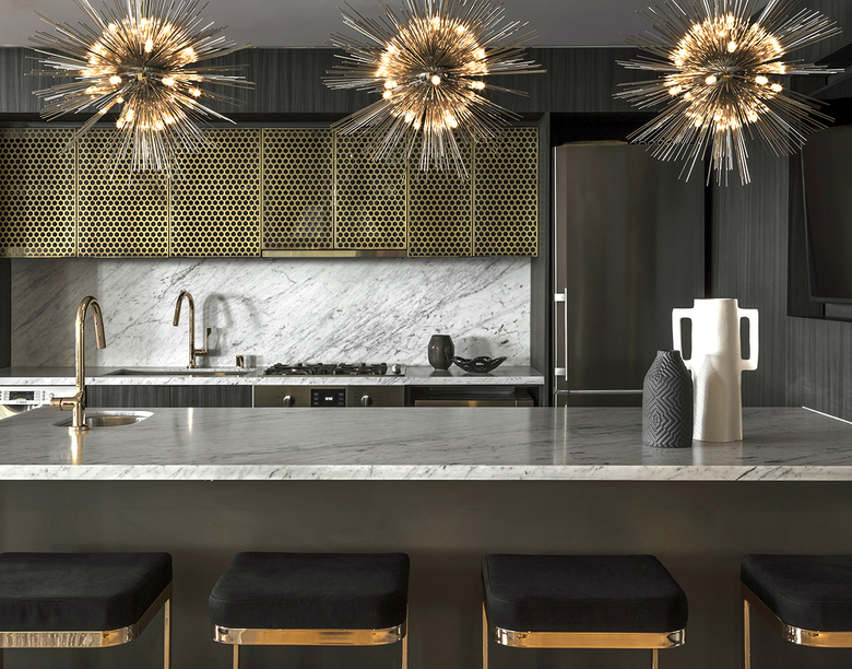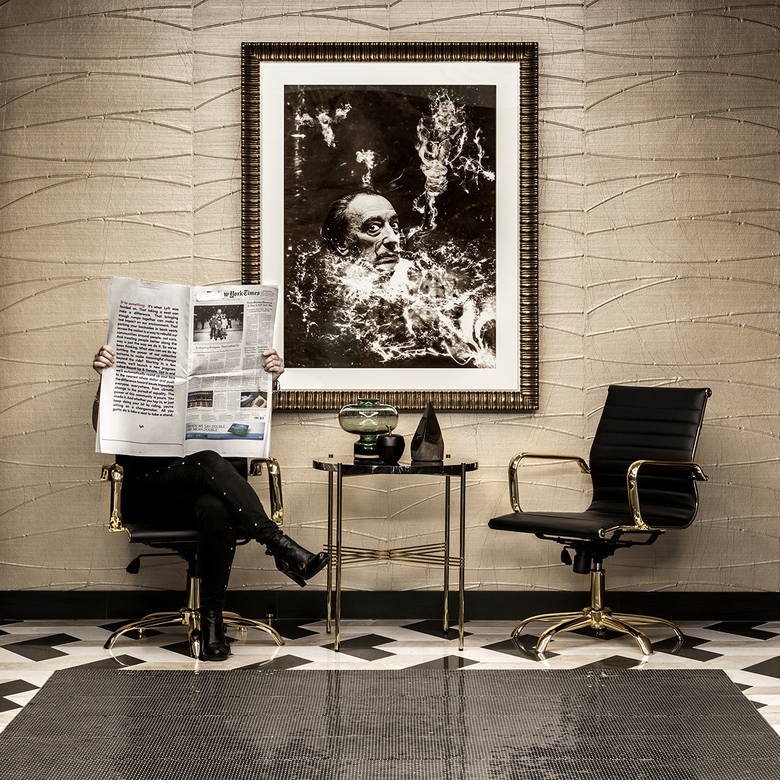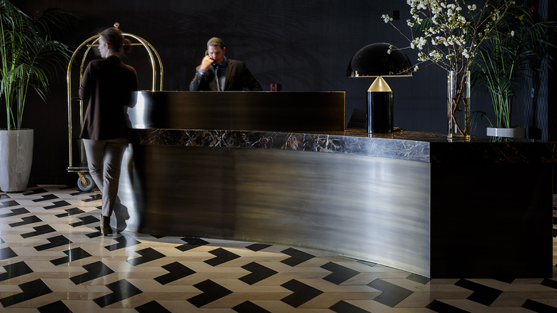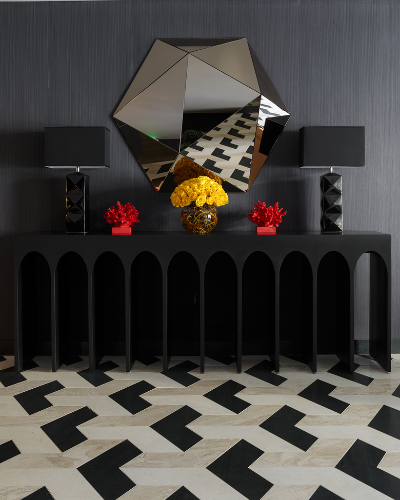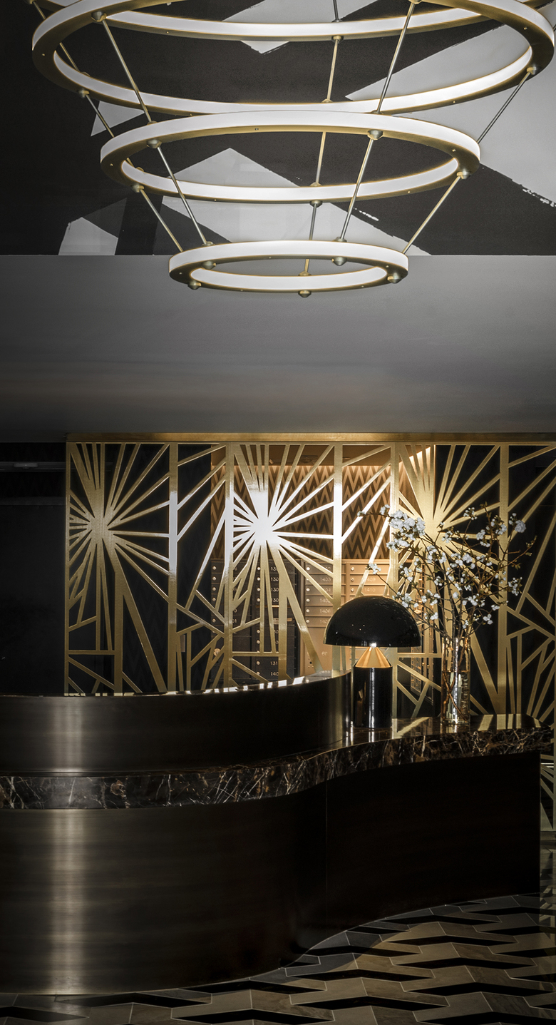 The residential experience at Ten50 begins with the lobby, and the first glimmer of inspiration came from a Raymond Chandler description of the (fictional) Treloar Building on Sixth and Olive, wherein he sums up an interior in a single phrase: “a vast black and gold lobby.”