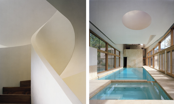 Taking its inspiration from the owners’ collection of glass art, this hybrid of home, private spa and art gallery explores qualities of transparency, water and light. The interior is conceived to indulge the clients’ passions, showcasing a vibrant collection of art and furniture, and establishing a private setting for health and wellness. In both its massing and its materiality, the exterior is designed to integrate with the natural landscape. Throughout, this very personal home blurs the boundaries between exterior and interior, building and nature, richness and simplicity, tradition and innovation.