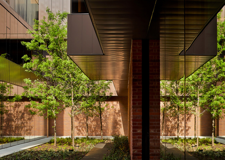 The façade, consisting of a palette of various brick, heavily tinted mirrored glass, and crust-faced limestone, is highly particularized and rich and becomes the architectural manifestation of the quilt. A garden in front, for delight and contemplation, is surrounded by a beech hedge for intimacy and privacy.