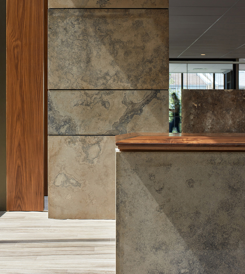 Once inside, the experience is about the engagement of the old and new and the organization, or the embrace, around the courtyard, which is the ever-present symbol of life-affirming green, water, and light (trees, fountain, and sunlight). Emphasizing the relationship between the old and new, the heritage building’s brick remains exposed in the Living Room. This central gathering space, featuring a two-storey atrium, is anchored by a full-height fireplace crafted from Algonquin Limestone. A bridge connects the heritage and new spaces on the second floor with long views stretching from end to end.