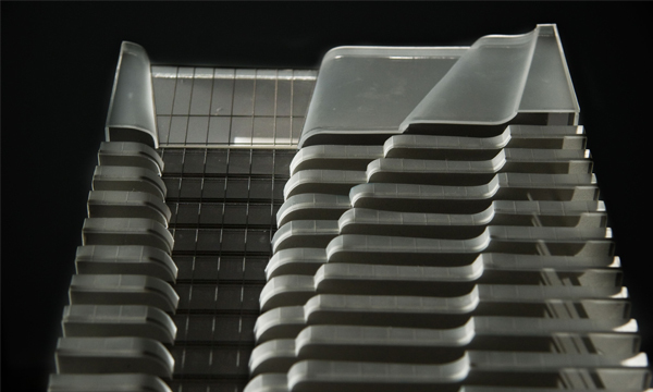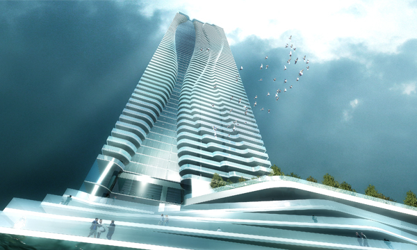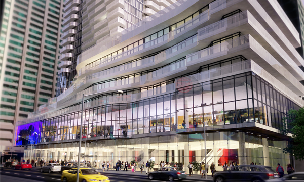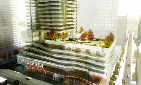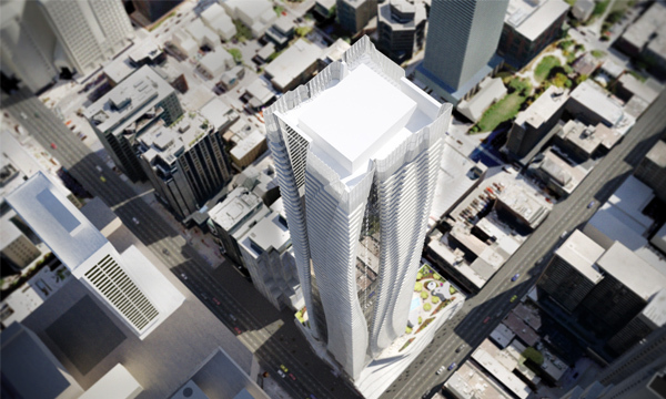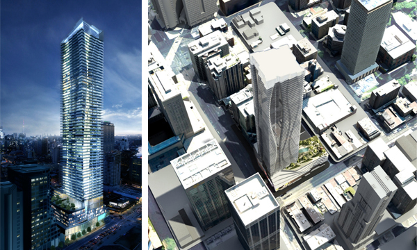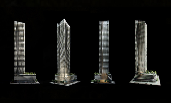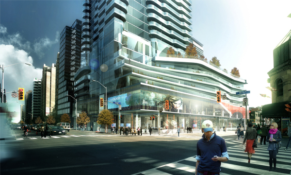Positioned at the south east corner of Yonge Street and Bloor Street, this notable site sits atop two converging subways lines and marks the eastern threshold into Canada’s premier shopping district; making it one of the most active and prominent intersections in the city of Toronto. The Northerly corners of the area were re-developed in the early 1970’s, but failed to celebrate the importance of this destination by locating the retail below grade; effectively turning their back to the street. Redeveloping this site with the goal of increasing density while contributing to the public realm with new connections to transit, street level retail and improved pedestrian thoroughfare is the source of both the constraints and opportunities which form the project. The new building is the instrument which restores the urban experience of the street, while signifying the corner as a landmark location. The building is comprised of a street level podium with retail and commercial space, and a 65-storey residential tower with sculpted undulating balconies. Carving into the existing zoning envelope, the six-storey podium terraces away from the street as it stretches northward; dissolving the corner mass and preserving the existing street scale. This allows the tower to be present at the intersection without dominating the area and permits south light to penetrate to the street below. The undulating curved balconies produce a façade that possesses duel qualities of playfulness and control, and dramatically contrasts the surrounding modernist high-rises to the north. The interior core maintains a more regular form to avoid compromising the suites, and serves as the backdrop from which the curving facade emerges from. The frit glass balconies pinwheel around the building; increasing in size for the preferential corner units, while capitalizing on view and light. The flowing lines of the facade will carry through to the sloped rooftop above, and stretch out into the podium below; marking key entryways into the building. This high-rise residential tower includes over 27,000 sf of resort-inspired amenities on the sixth and seventh floors designed by Cecconi Simone, plus an additional 19,000 sf of outdoor amenity space on the seventh floor by Janet Rosenberg + Associates, Landscape Architecture/ Urban Design.