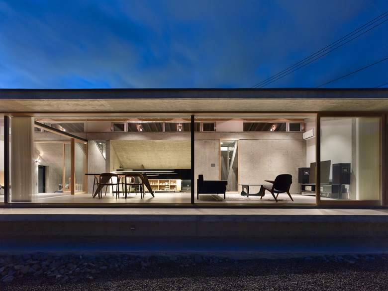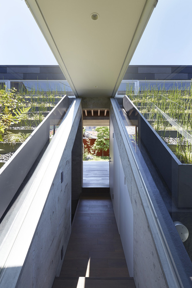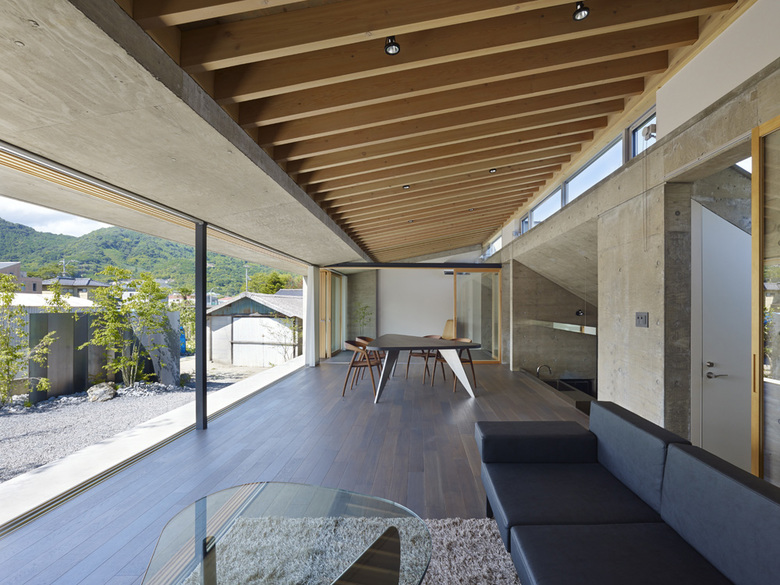 The structure is a mixture of RC and wood. RC was selected for the large openings to the south garden and for the waterproofing of the green roof, while wood was used for the rest of the structure. Furthermore, the RC structure bears the horizontal forces, making it unnecessary to have walls to bear the horizontal forces in the wooden structure, thus expanding the LDK.