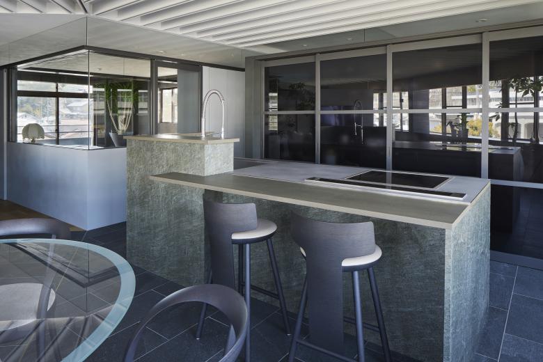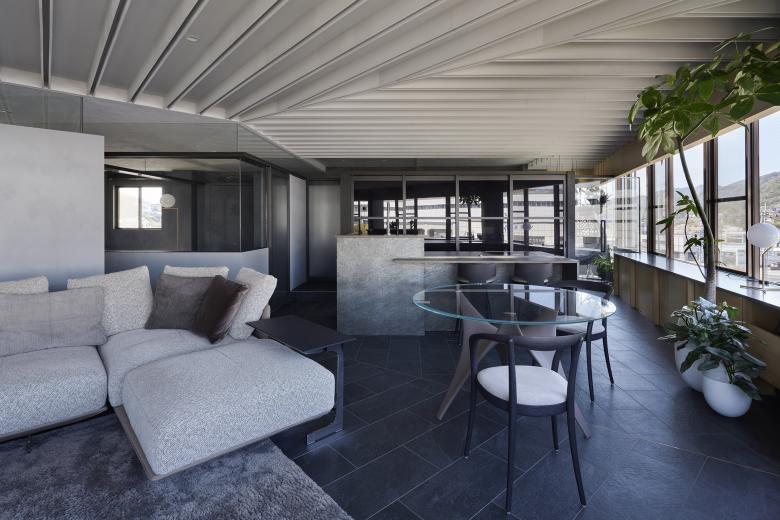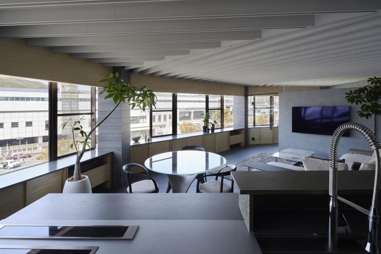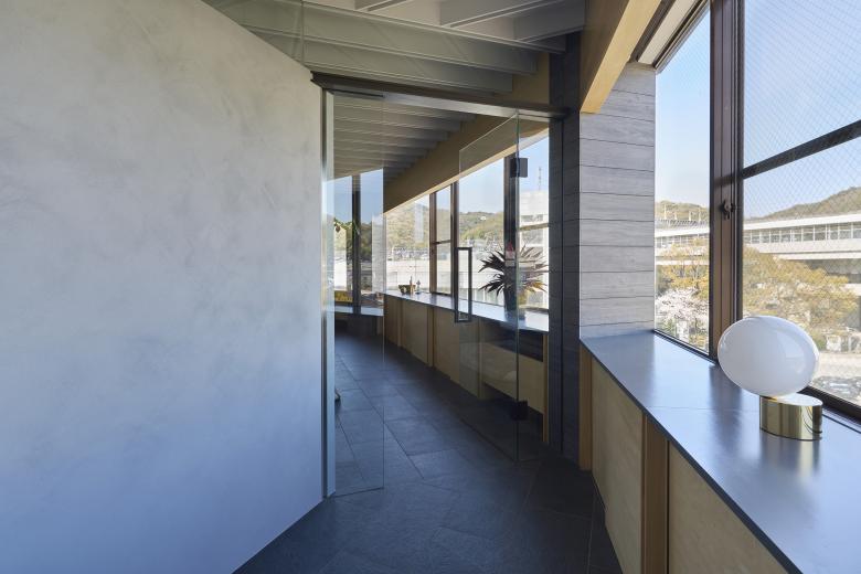 Onomichi is associated with a seaside townscape, but the site is located on the inland side of the city. Although the building was intended as a building, the top floor was originally planned as a residence, and was renovated to suit the lifestyle of the new residents. The building has a fan-shaped exterior that matches the shape of the site, and is characterized by a series of panoramic openings, and we aimed to create a space that maximizes the enjoyment of this expanse. The composition of the building is as follows