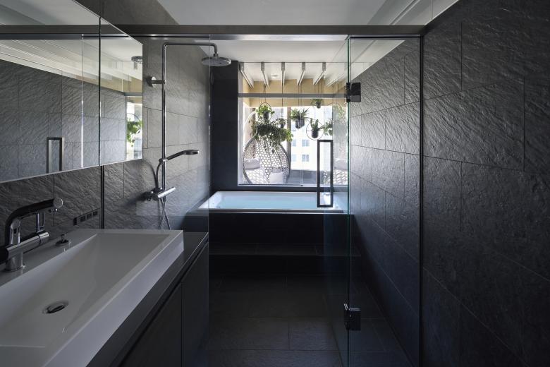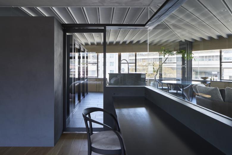 The above actions created a space that satisfies openness, continuity, and daylight control. In addition, as has been the practice in previous house renovations, the ceilings between the rooms are made continuous by using glass between the railing above the fixtures, and the ceiling surfaces of the partition walls are also made of glass, creating a state of connection despite the partitioning. The bathroom is protected by the inner terrace in the foreground, where one can enjoy the view of the mountain range. In the bedroom, the glass from the waist wall up connects the living room with the view of the mountains beyond.