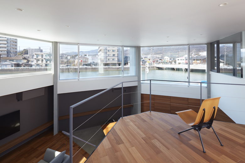 The road on the west side of the river is about 1m higher than the site, so when the main living space is on the first floor and openings are set up, the view from the road is all that one is concerned about, and the mountains in the distance cannot be seen. The first floor is protected from the surrounding environment by narrowing the openings and opening to the sky through the atrium. The atrium serves as a boundary to the exterior. The atrium serves as a boundary with the exterior, and the space and landscape seen from the second living room, bedrooms, and children's room are gently connected through the boundary. The exterior wall on the west side is bent into a fan shape, allowing a panoramic view of the landscape extending from the river to the mountains to be taken in. The wall columns at the points of inflection bear the horizontal forces, and a large opening is realized despite the wooden construction.