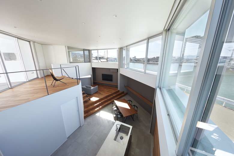 A river runs across the road on the west side of the site, and looking to the north, a beautiful mountain range spreads out beyond the cityscape. We considered the “boundary” to realize a lifestyle that incorporates a rich environment, while taking into consideration the noise from the road along the river and the nearby national highway, as well as the need to ensure privacy.