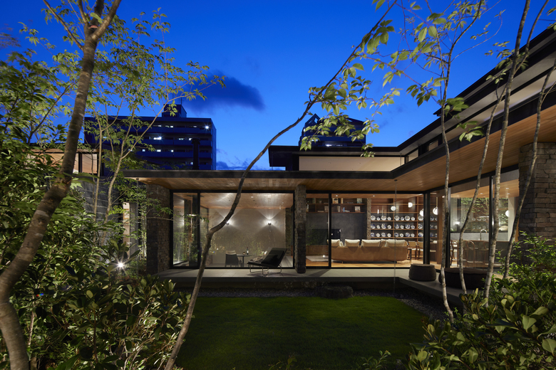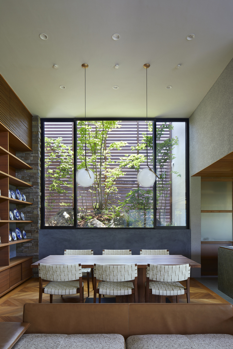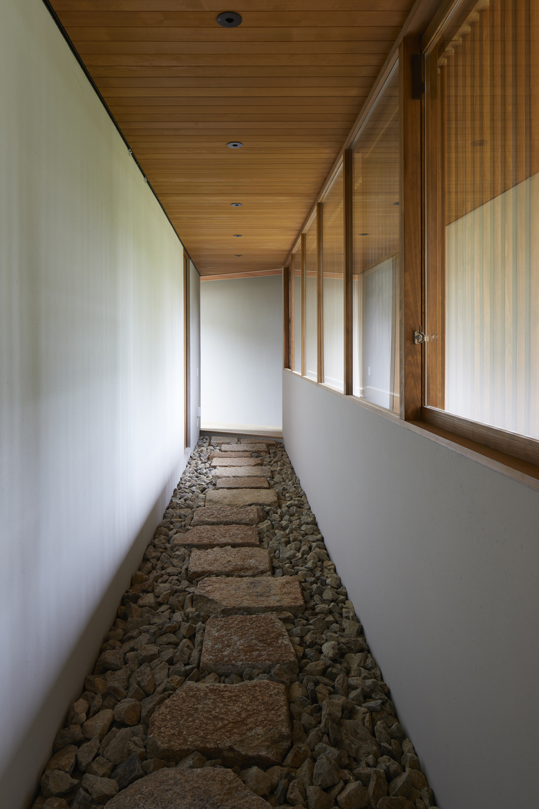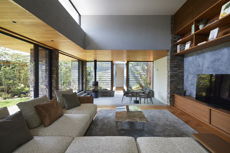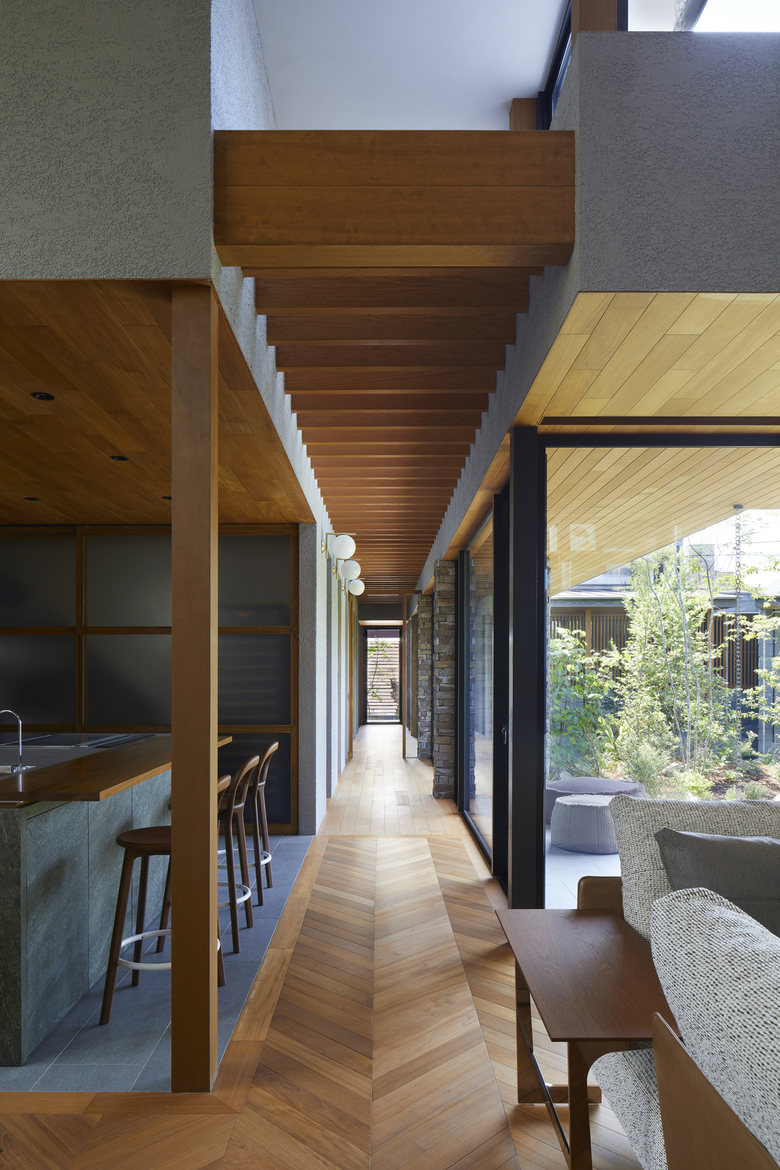 The rooms are arranged in a “L” shape in line with the site boundary, and the gaps between rooms are used as corridors to enjoy the courtyard and the garden. The size of the rooms is adapted to the surrounding environment, and the arrangement of the rooms is determined by the various living scenes and stories to accommodate future lifestyle changes. Although the house is divided into separate buildings, the large courtyard located in the center of the building directs the eye toward it, creating a cohesive structure as a house. When the windows of each garden are opened, the wind blows through, and the sounds of leaves and branches rustling, the fragrance of flowers, and the chirping of birds in the garden can be felt as if one were in the midst of nature, even when indoors. The eight courtyards, created by the gaps between the rooms, have different characteristics in terms of scale, height, lighting, and ventilation, allowing the residents to enjoy various expressions as the seasons change.