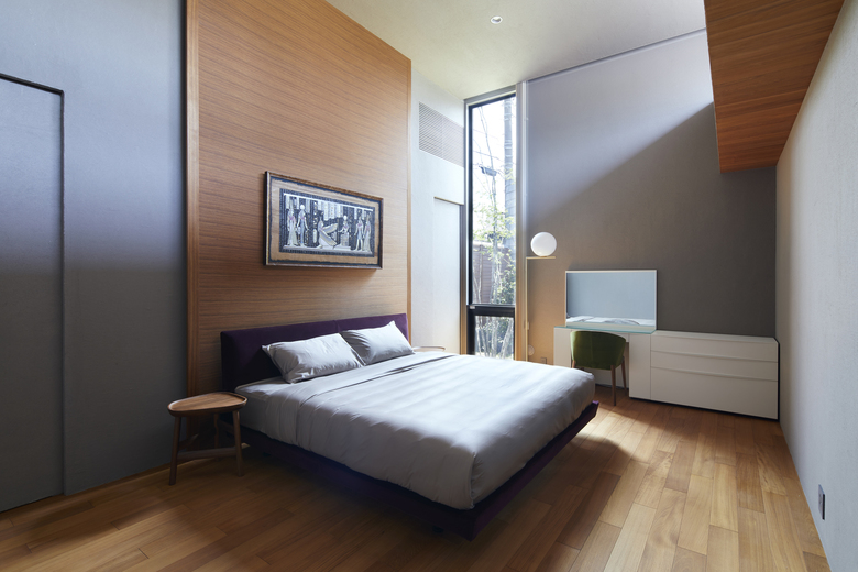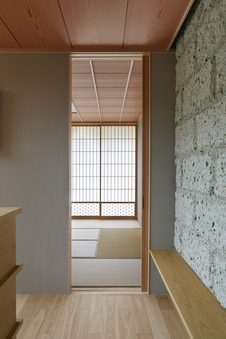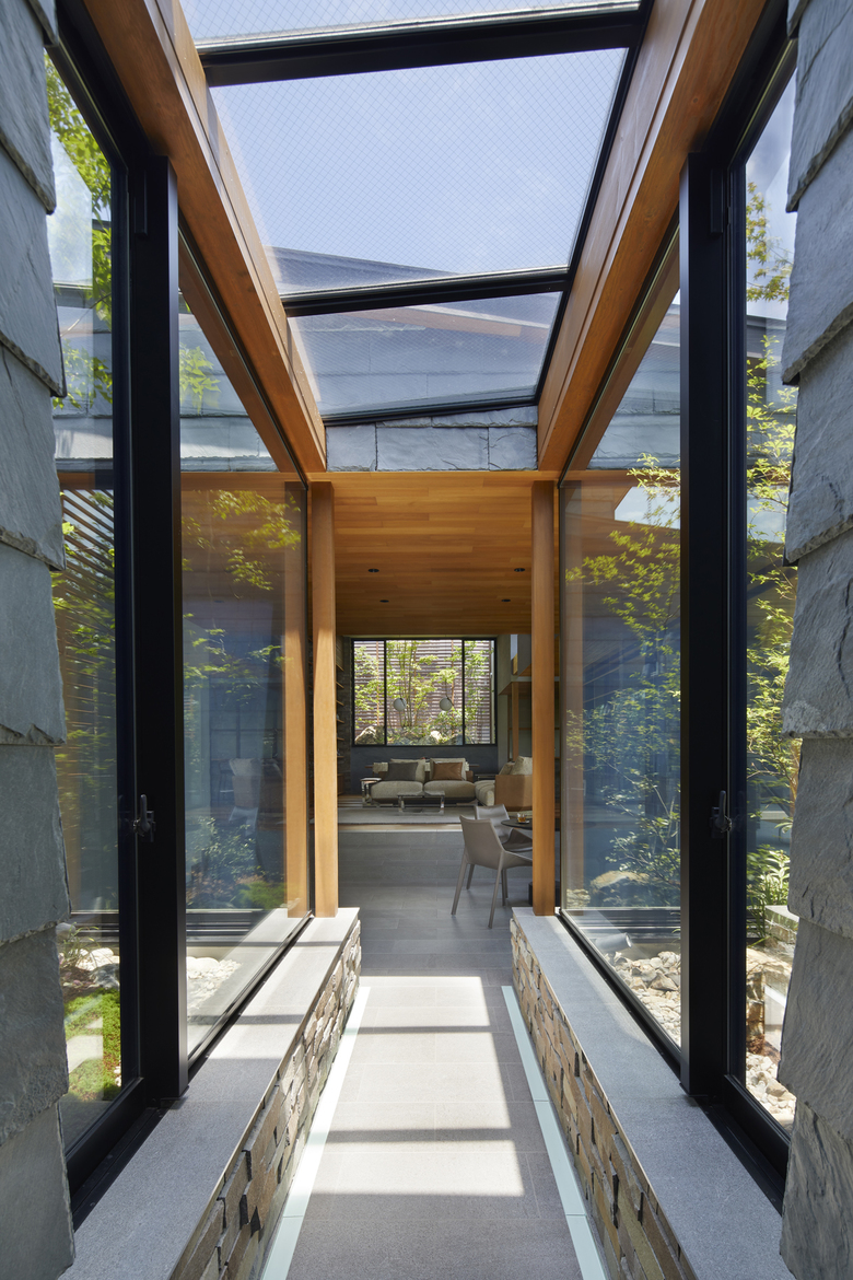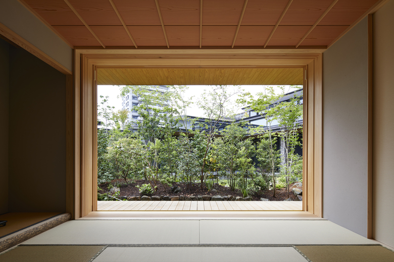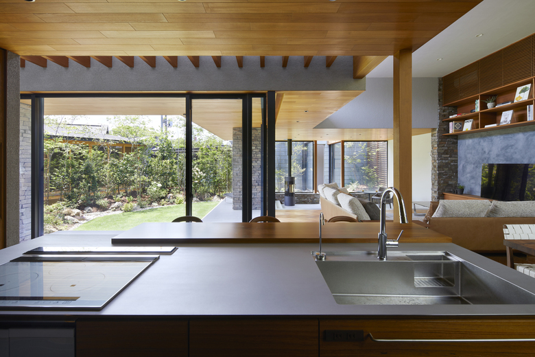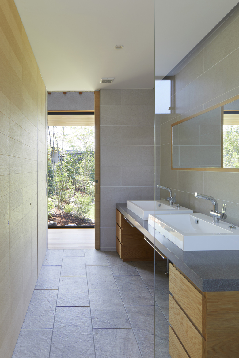 The rooms are arranged in a “L” shape in line with the site boundary, and the gaps between rooms are used as corridors to enjoy the courtyard and the garden. The size of the rooms is adapted to the surrounding environment, and the arrangement of the rooms is determined by the various living scenes and stories to accommodate future lifestyle changes. Although the house is divided into separate buildings, the large courtyard located in the center of the building directs the eye toward it, creating a cohesive structure as a house. When the windows of each garden are opened, the wind blows through, and the sounds of leaves and branches rustling, the fragrance of flowers, and the chirping of birds in the garden can be felt as if one were in the midst of nature, even when indoors. The eight courtyards, created by the gaps between the rooms, have different characteristics in terms of scale, height, lighting, and ventilation, allowing the residents to enjoy various expressions as the seasons change.