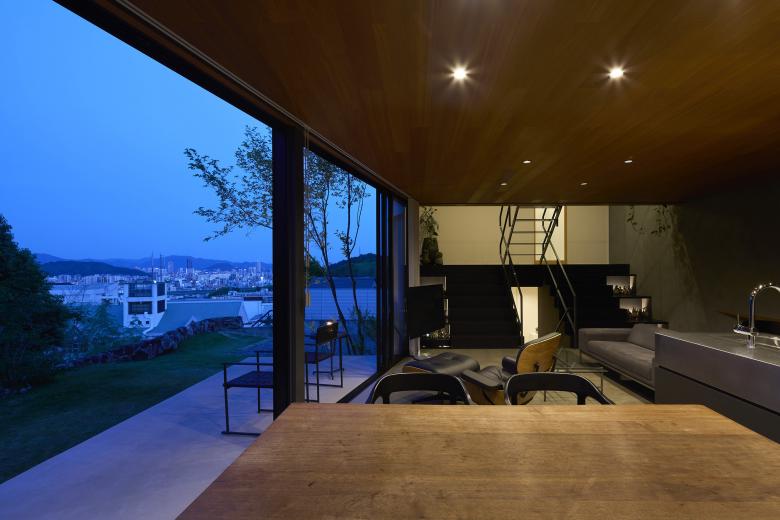 The living room on the first and fifth floors opens to the outside, connecting the interior and exterior horizontally. The bathroom on the second floor overlooks a virgin forest, protected by trees in the foreground, while the second living room on the 2.5F offers a panoramic view of the sky and the city of Hiroshima.