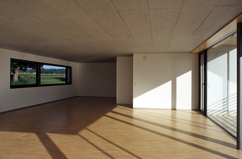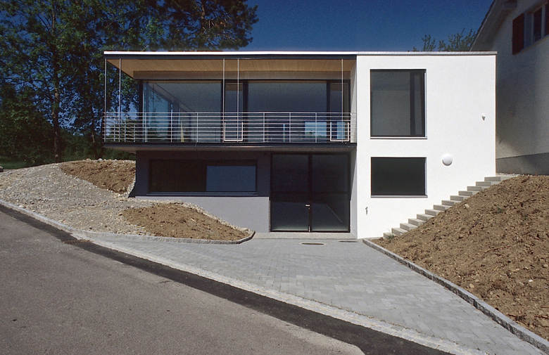Auf dem Restgrundstück einer bestehenden Liegenschaft sollte ein Büroatelier gebaut werden, welches später in eine Wohnung umgewandelt werden kann. Balkon und Dachvorsprünge bieten eine gewisse Geborgenheit an dieser Lage. Sie sind die vorgelagerte Fortsetzung des Innenraums nach aussen. Die rahmenlos wirkenden Fenster unterstützen den fast nahtlosen Übergang von innen nach aussen.