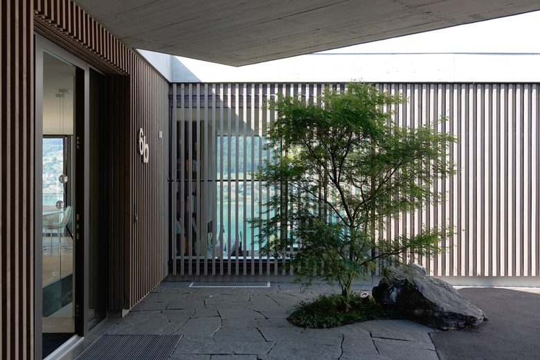 Das ausgesprochen schlicht gehaltene Gebäude entwickelt durch seinen Z-förmigen Grundriss schöne Sichtbezüge, Höfe und Nischen. In diesem Haus gibt es keinen Ort, welcher nicht von einer eigenen attraktiven Situation profitiert.