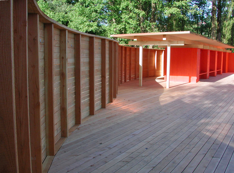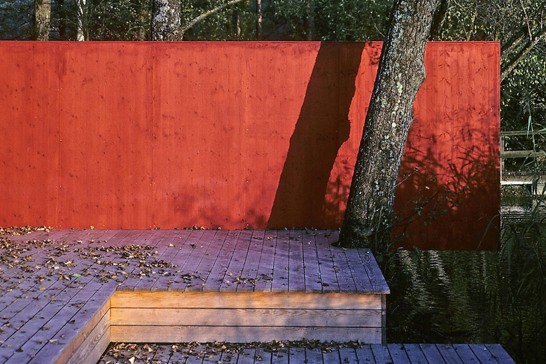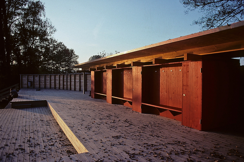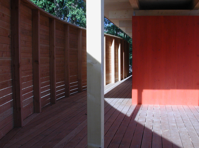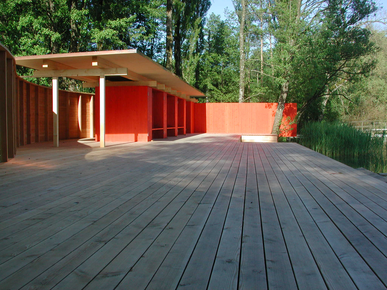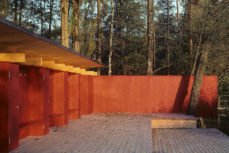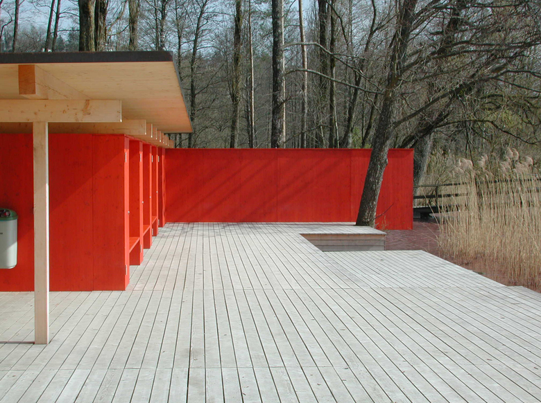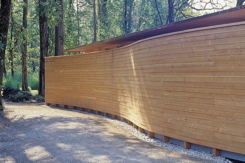 An diesem unberührten Ort verschwindet der behutsame Landschaftseingriff fast vollständig, indem die Anlage in verschiedene architektonische Elemente aufgegliedert wurde. Durch das wechselseitige Zusammenspiel des einfachen Baukörpers mit der nischenbildenden Wand, welche sich dem Weg entlang schmiegt, strahlt die Anlage Geborgenheit und Stille aus.