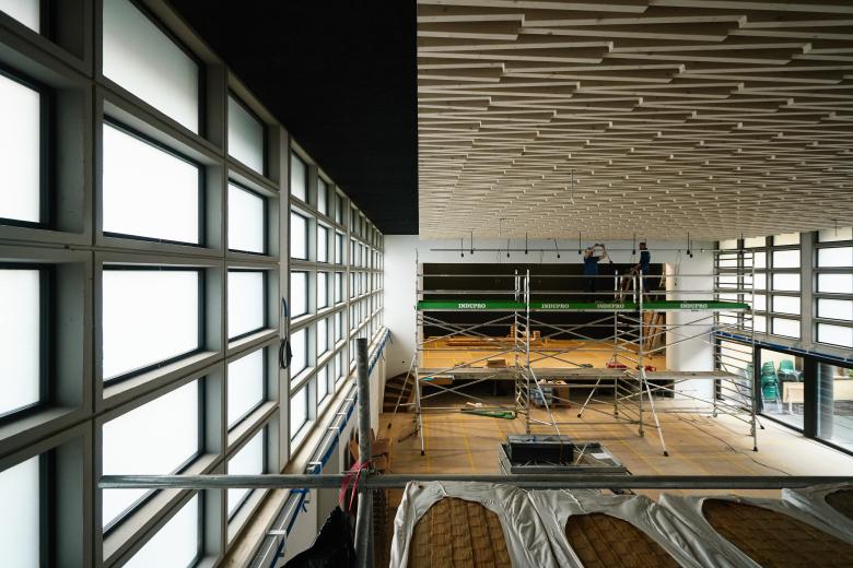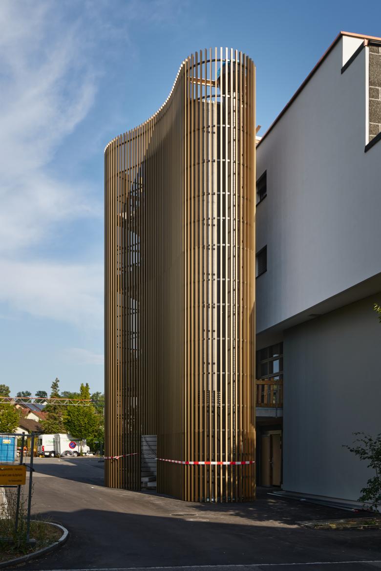 Jedoch bedarf das ganze Gebäude (mit Ausnahme bereits renovierter Wohnungen) einer umfassenden Gesamtsanierung, um alle heutigen Vorschriften und Nutzungsbedürfnisse zu erfüllen. Die daraus notwendigen sichtbarsten Massnahmen sind die neuen Fenster, die neue Gebäudehülle sowie das neue Fluchttreppenhaus. Gemessen an unserem Anspruch, den überdurchschnittlichen architektonischen Charakter des Chappelehofes zu bewahren, sind das massive Eingriffe. Deshalb ist die neue Fassadenkonstruktion so gewählt, dass sie weiterhin verputzt erscheint . Die stilprägenden hölzernen Vertikallamellen werden wiedergebaut, jedoch neu in dauerhaftem bronzenen Alu. Das komplett neue Treppenhaus erhält eine Freiform, um die klaren Formen des bestehenden Gebäudes nicht zukonkurrieren.