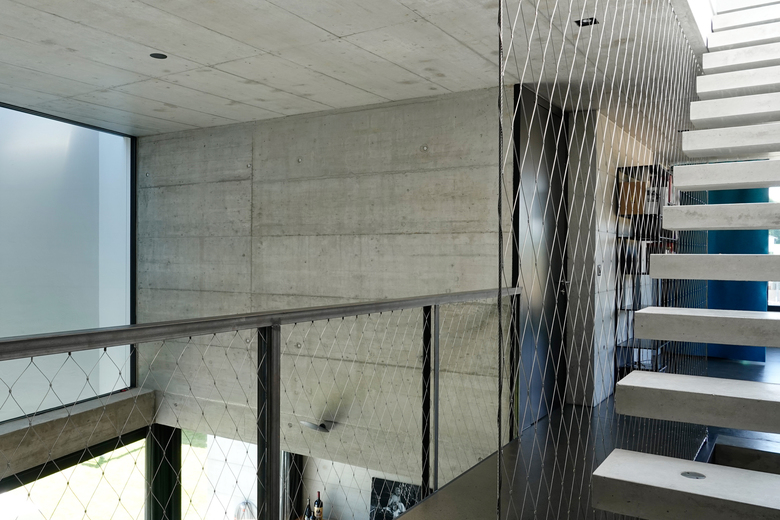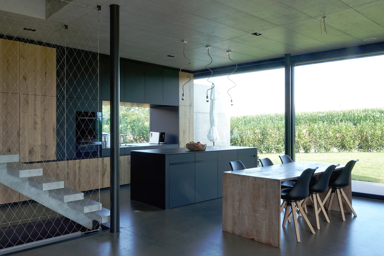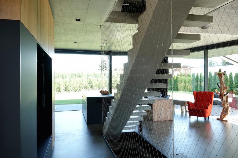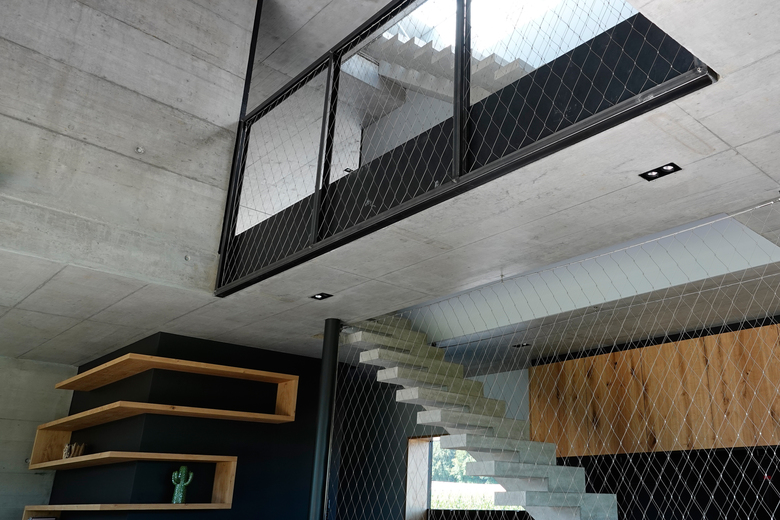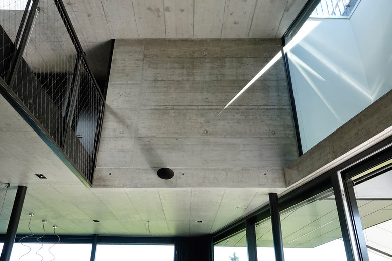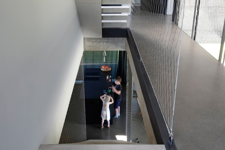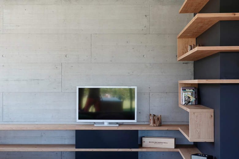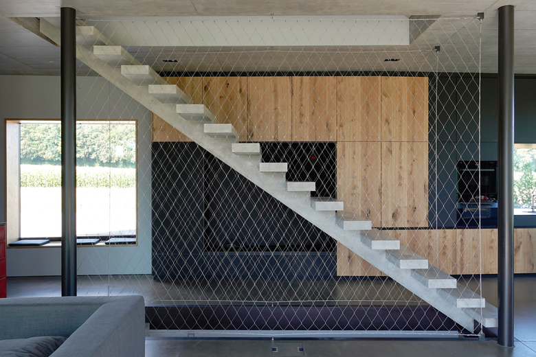 Im Fokus steht jedoch die innenräumliche Qualität, bei welcher der zweigeschossige Wohnraum im Zentrum steht und die beiden Geschosse miteinander verschmelzen lässt. Um ihn herum ist alles angeordnet und es gibt keinen Gang durchs Haus, wo man nicht an ihm vorbeikommt. Sei es über die inszenierte Treppe oder die am Luftraum vorbeiführende Passerelle. Jeder Weg durchs Haus wird zum tagtäglichen Erlebnis unterschiedlichster Raumbezüge.