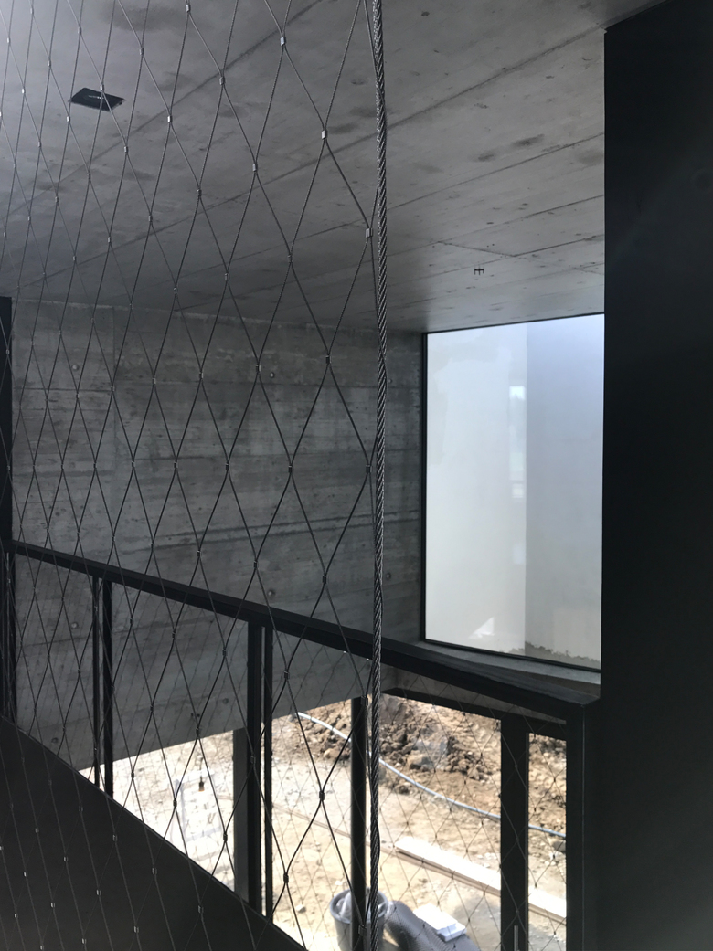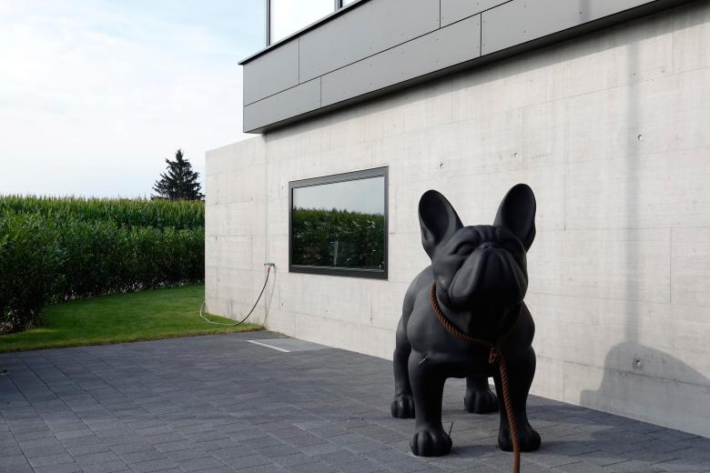 Das architektonische Konzept präsentiert sich als schwarzer Kubus, welcher auf eine mäandrierende Betonscheibe gestellt ist. Die teilweise bis 3 Meter auskragenden Gebäudeecken bestärken diesen Gedanken zusätzlich.