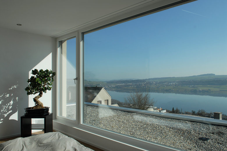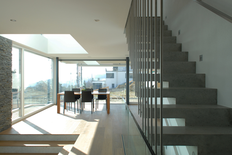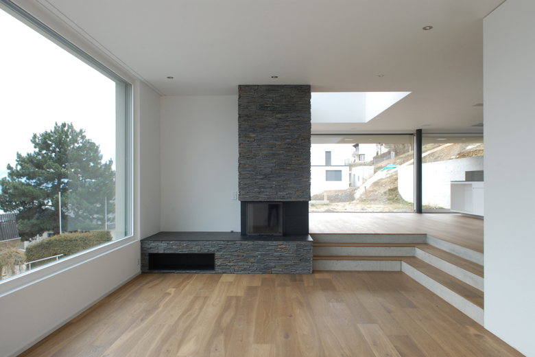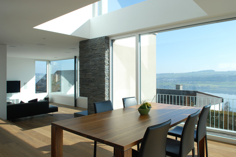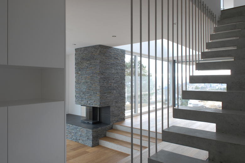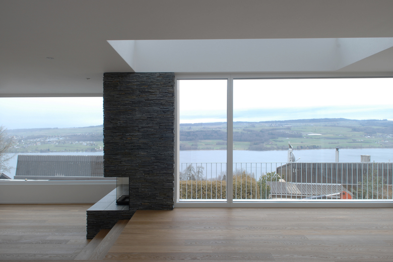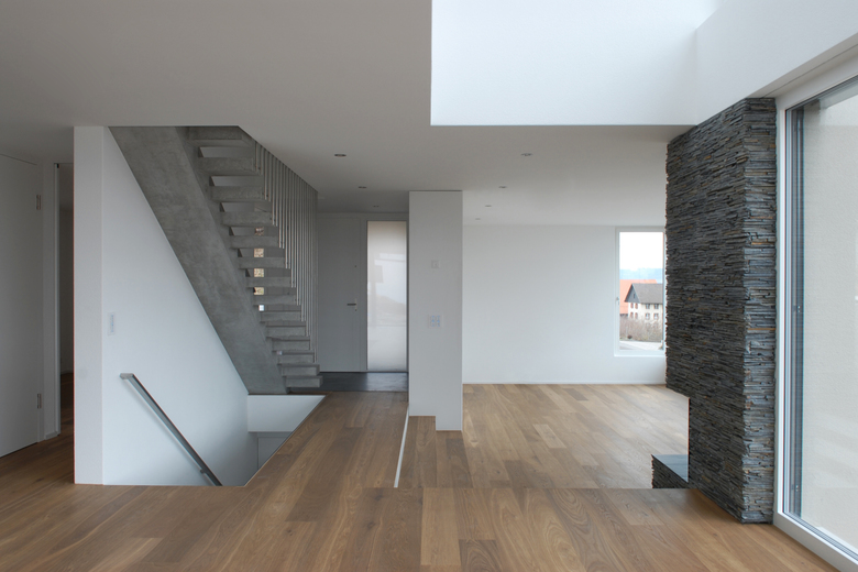 Auch im Innern erlebt man die Geschosse auf verschiedenen Levels und schafft mit daraus entstehenden Überhöhen neue Raumerlebnisse. Mit Rundlauf und Luftraum im Wohngeschoss werden nebst aussen- auch innenräumlich interessante Bezüge geschaffen. Diese werden auch im Obergeschoss weitergeführt und runden das Projekt zusammen mit einer uneingeschränkten Seesicht ab.