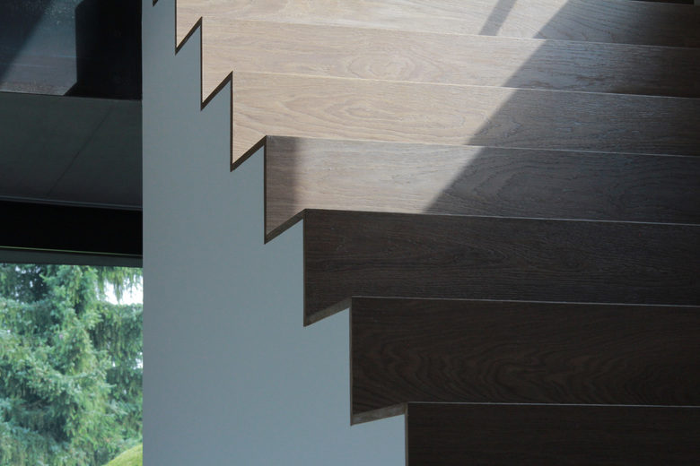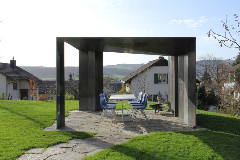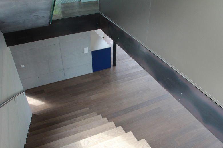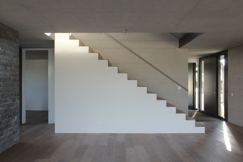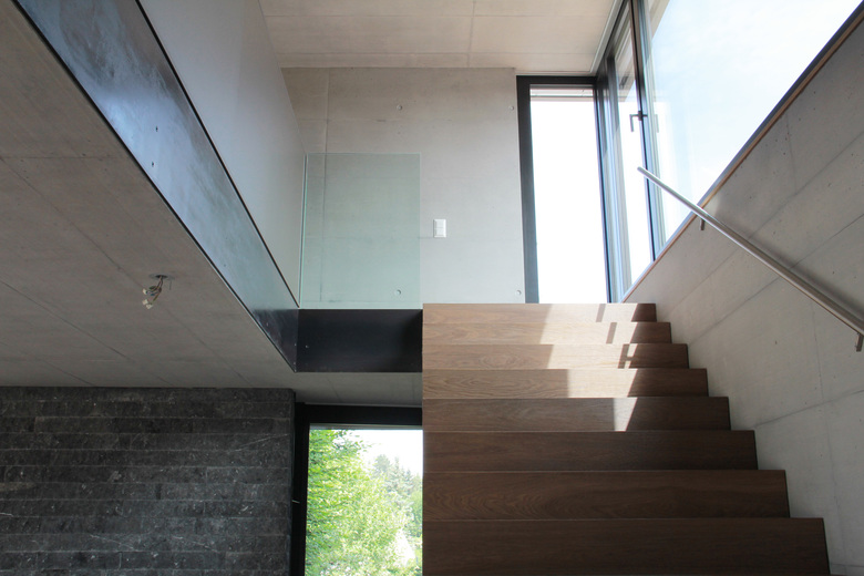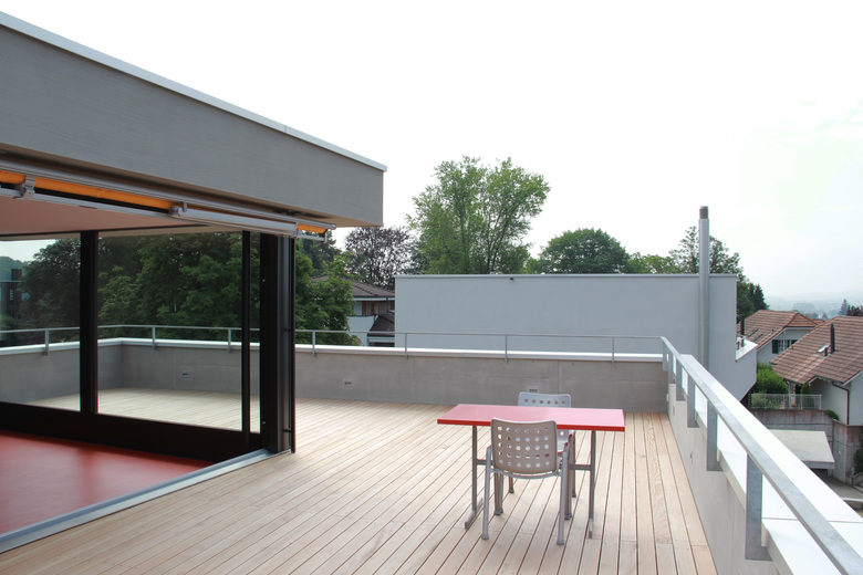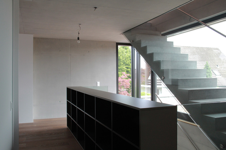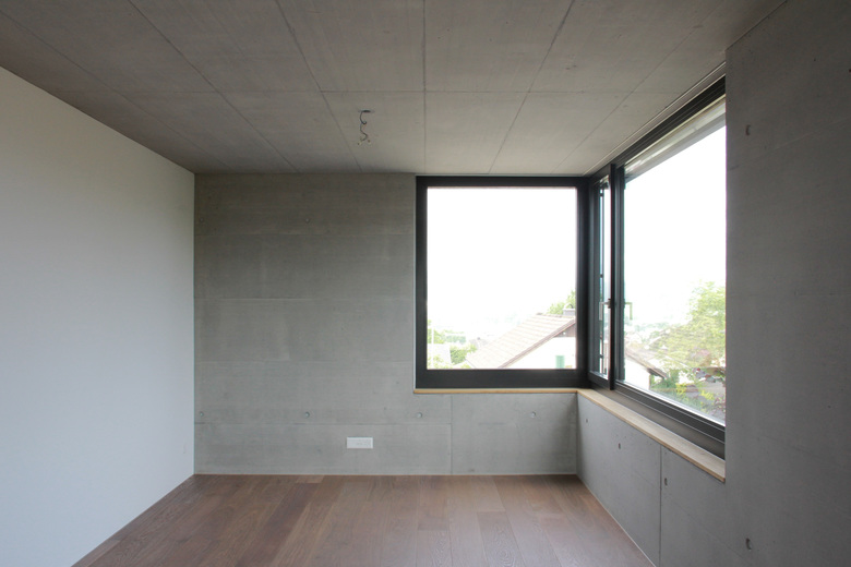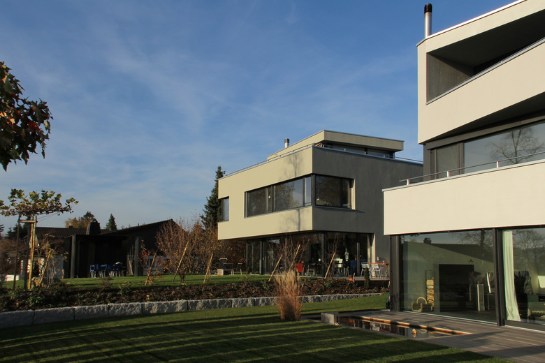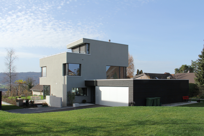 Das Haus ist so ausgelegt, dass alle bewohnten Räume direkt von der schönen Lage profitieren. Die Weiterführung des Holzbodens in den Garten lässt das sehr transparente Wohngeschoss mit dem Aussenraum verschmelzen. Auch dieser ist als „Wohnbereich des Sommers“ mit verschiedenartigen Aufenthaltsbereichen ausgestattet. Das Attikageschoss ist über einen belichteten Luftraum erschlossen. Die Dachterrasse bietet noch einen zusätzlichen, ganz privaten Aussenraum mit noch intensiverem Aussichtgenuss.