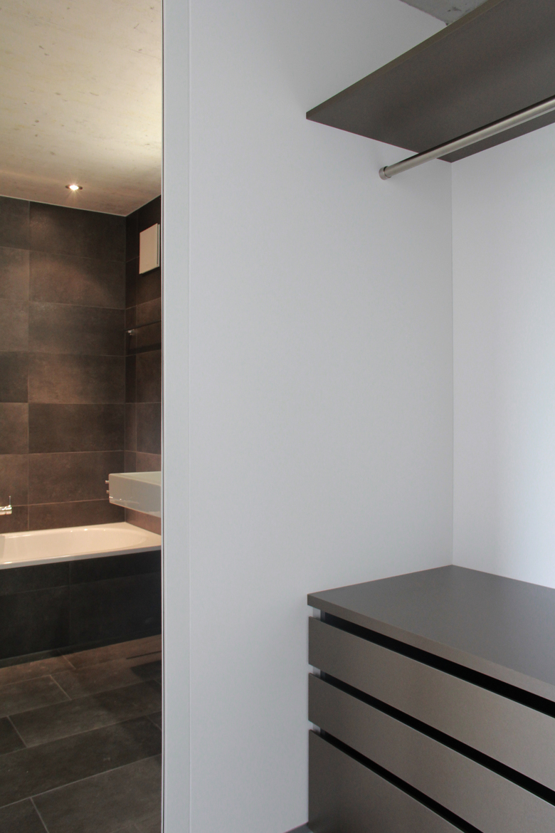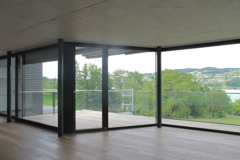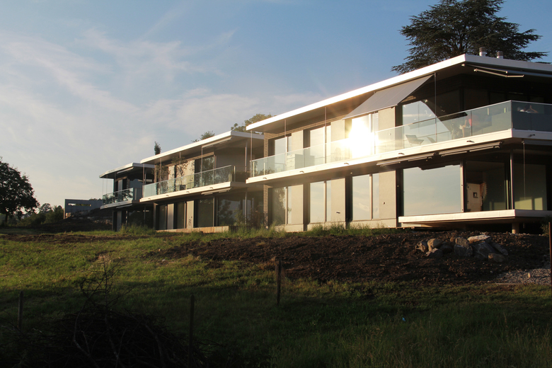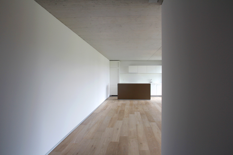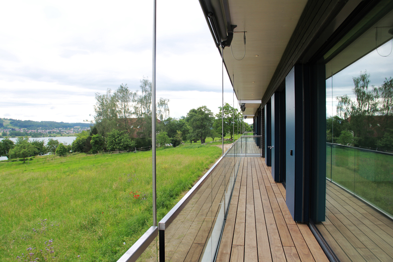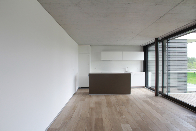 Nahtlos brandet die Landschaft an die Wohnungen. Dementsprechend spürt man sich von innen in die Landschaft integriert. Verstärkt wird dieses Gefühl durch die hineingezogenen Fassadennischen. Die intimen Aussenräume lassen einen starken Bezug zum See entstehen.