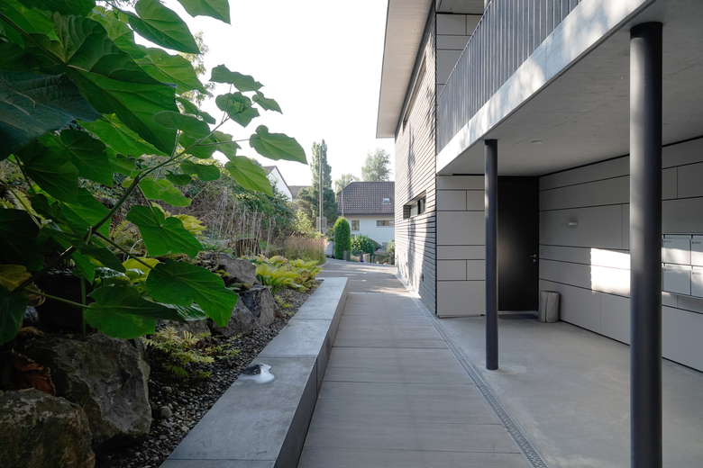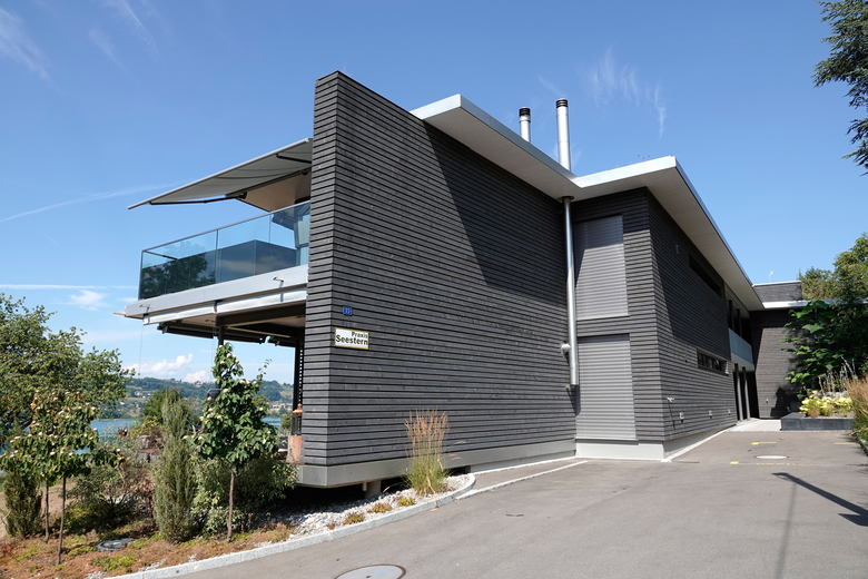 Die Parzelle liegt im Spannungsfeld zwischen der unberührten Hallwilerseelandschaft und stattlichen historischen Bauernhäusern. Damit das bestehende Ortsbild vom See aus erhalten bleibt, wurde der Neubau sehr niedrig gestaltet. Zudem wird durch das naturnahe Grau der Fassade das Gebäude diskret in die Umgebung eingebettet.