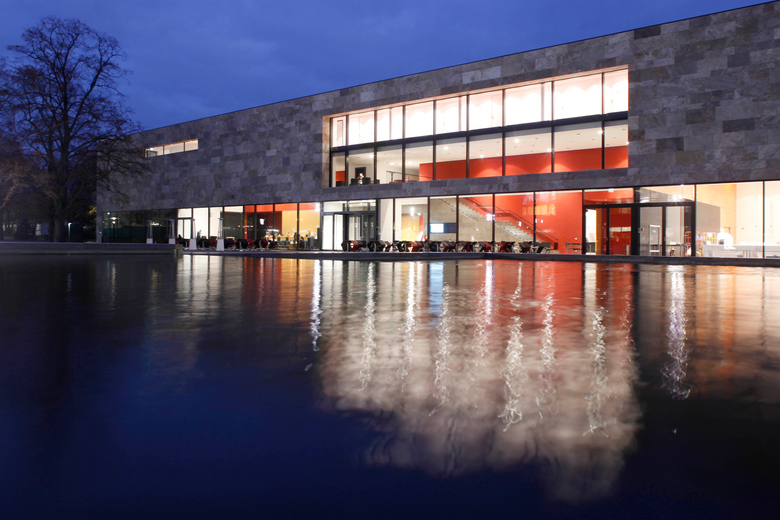 Der Anbau an das Casino ist die Schnittstelle zwischen Alt- und Neubauten. Er orientiert sich zum neuen Platz wie auch zu dem denkmalgeschützten südlichen Park. Flexibel unterteilbare Säle und ein großzügiges Foyer sind für den Mensabetrieb wie auch für Veranstaltungen gleichermaßen geeignet.