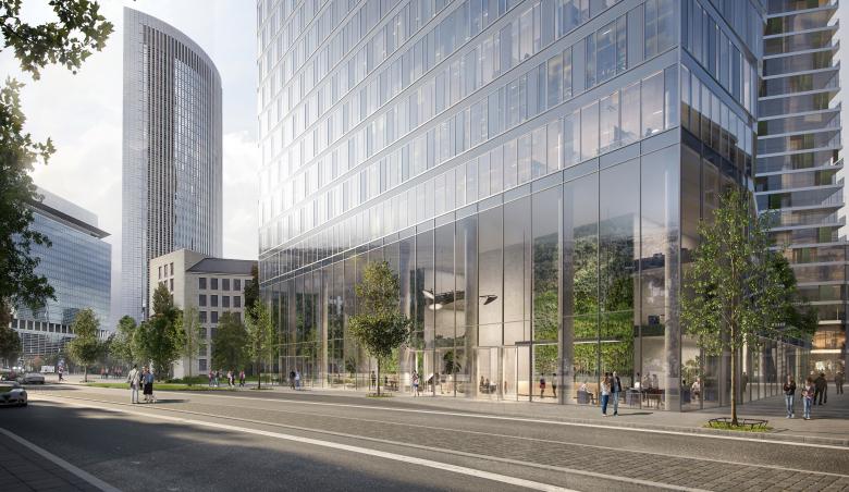 Die Eingangshalle des Erdgeschosses findet sich als Pendant und zur Gliederung des Turm in als öffentliche und ablesbare Skylobbys in großer Höhe wieder. Erneut über die volle Breite von 60m und mit doppelter Raumhöhe (9 m) liegen im 29 Geschoss die Halle, das Restaurant und der Garten des Hotels und im 42 Geschoss die Verteilerlobby und die Besprechungsräume der oberen Büroebenen.