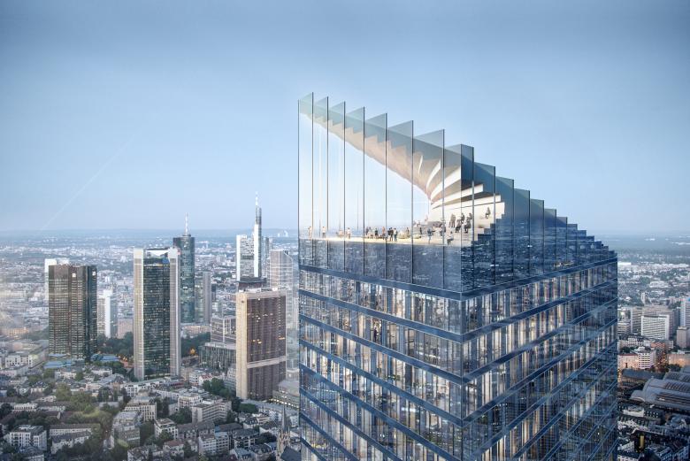 Der Abschluss bildet die Skyhall - eine Spitze für Frankfurt. In ca. 266m Höhe wird öffentlich den Besuchern ein spektakulärer Raum angeboten, die sich als Himmelstreppe nach oben windet und die sich der Stadtmitte und dem Mainufer zuwendet. Weit mehr als die eigentlich geforderte Besucherplattform und mit einem Alleinstellungsmerkmal in Europa stellen wir uns hier einen verglasten 18m hohen Raum vor, auf dessen Sitzstufen, die die verspringenden und verdrehten Ebenen des Gebäudes noch einmal thematisieren, die Besucher den besonderen Ort genießen.