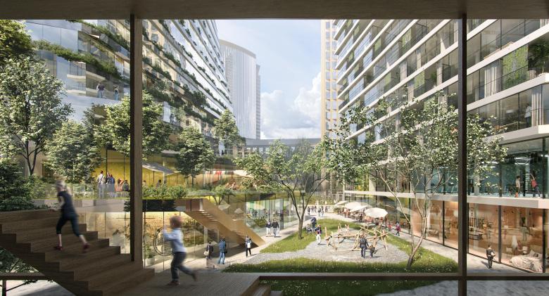 Der Einbindung und Verzahnung der unteren Ebenen der Hochhäuser haben wir ein ganz besondere Aufmerksamkeit geschenkt. Die Haupteingänge des Wohn- und Büroturms wenden sich dem öffentlichen Freiraum – der Plaza – zu. Besucher werden von hohen Hallen empfangen, die von attraktiven Nutzungen, Restaurants, Läden und einer Kantine umgeben sind. Signifikant wird sein, dass es sich um shared lobbies handeln wird, was bedeutet, dass die Gäste des Hotels, die Mitarbeiter der Büros und die Besucher der Aussichtsplattform zunächst in die gleiche riesige Halle gehen, die sich um die Ecke und entlang der Osloer Straße entwickelt. Zwischen den drei Türmen gibt es einen neuen kleinen Platz mit Wasserbecken und jenseits der Einschnürung und direkt vor der Kita einen geschützten Quartiersplatz.
