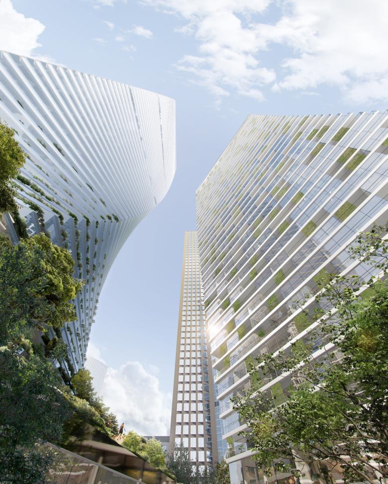 Die Volumen von Tower A und Tower B sind so geformt, dass ein größtmöglicher Zwischenraum zwischen beiden und als Fuge zum Tower 185 entsteht und alle Büros und Wohnungen so viel wie möglich freie Sicht genießen. Dies wird erreicht durch das Aufdrehung beider Türme und Fassaden.