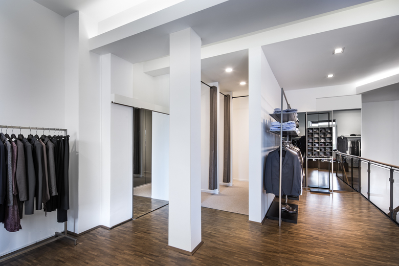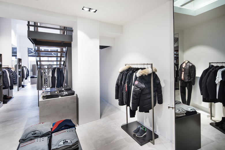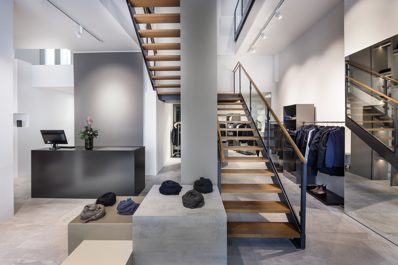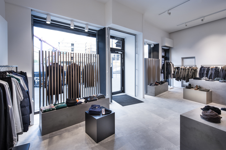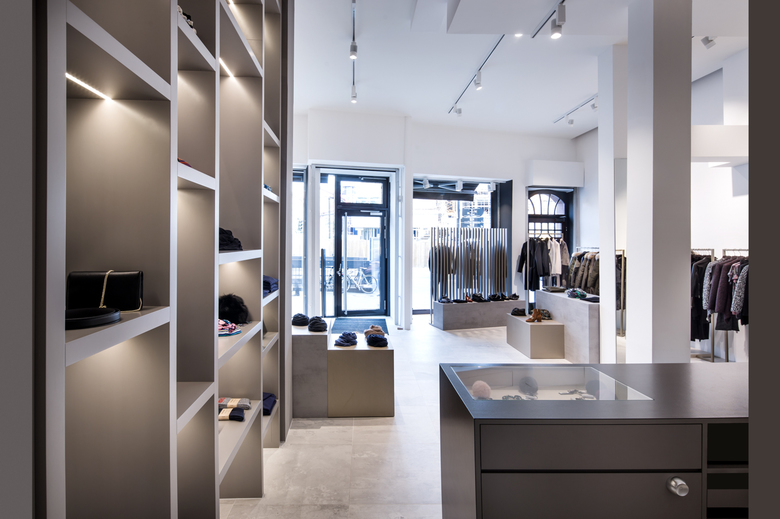 Die Ladeneinrichtung und die Warenträger wirken in den etwa vier Meter hohen Räumen sehr minimalistisch und pur. Fast galerieartig lassen einfache Kuben, Kleiderstangen und schlichte Regale die Ware in den Vordergrund treten.
