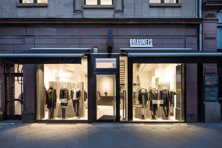 Der angesagte Damen- und Herren Textiler „Brauneis“, an der „Großen Eschenheimer Straße“, erweiterte im August 2017 seine bestehende Verkaufsfläche. Das attraktive Ladenlokal wurde im Erdgeschoss um ca. 70 m² vergrößert. Mittels eines großflächigen Durchbruchs wurde die danebenliegende Geschäftsfläche hinzugenommen. Damit veränderte sich auch die Fassadengestaltung des Frankfurter Modeanbieters. Symmetrisch aufgebaut präsentieren sich nun zwei Schaufenster in der stilvollen alten Stein-Fassade. Eine moderne und transparente Lamellengestaltung bildet die Rückwand des Schaufensterbereiches und sorgt für gelenkte Einblicke in den Verkaufsraum.