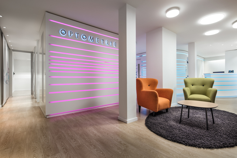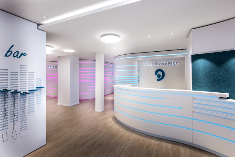 Für die Kundinnen und Kunden erkennbar aufgeteilt, werden die Bereiche durch ein geschmackvolles Farb[leit]system. Der Fachbereich Optik trägt die Farbe Magenta, die Hörakustik die Farbe Türkis – übernommen aus den Farben des Müller-Logos. Türkise und Magenta farbene, eingelassene LED Streifen, lockern die geschwungenen Wände der Untersuchungsbereiche, im hinteren Bereich des Ladenlokals, auf und bieten den Kundinnen und Kunden zugleich eine optimale Orientierung. So beherbergt der linke Teil dieses Flurs, in Magenta, die Optik-Untersuchung (Optometrie) und der rechte Teil, inklusive einer großzügigen Theke, gehört zur Akustik.