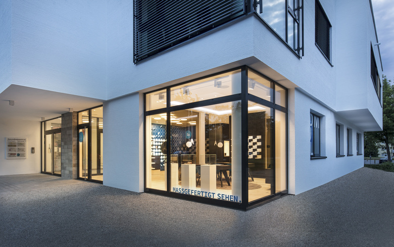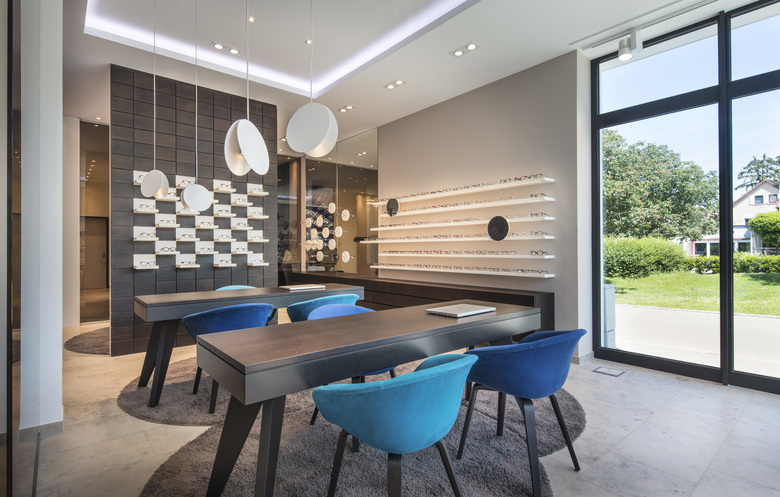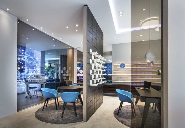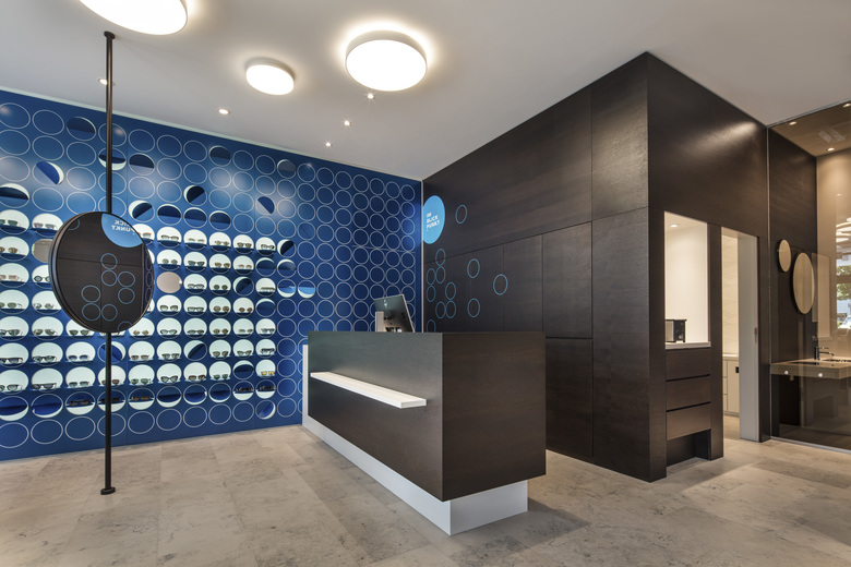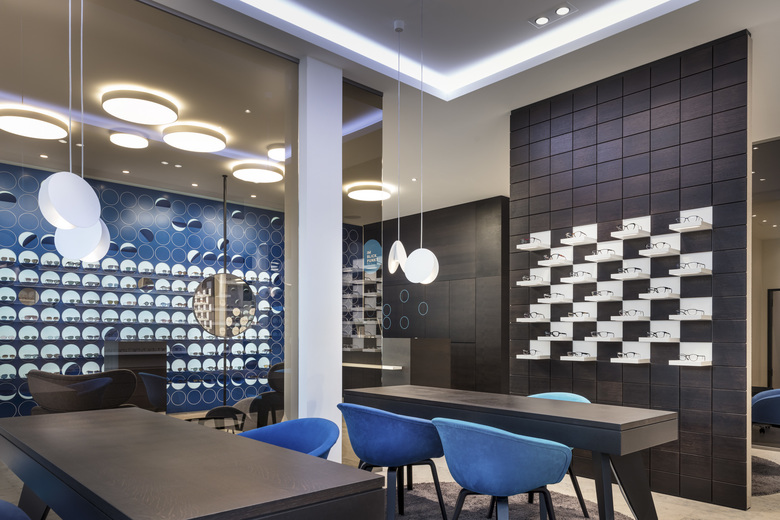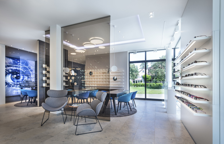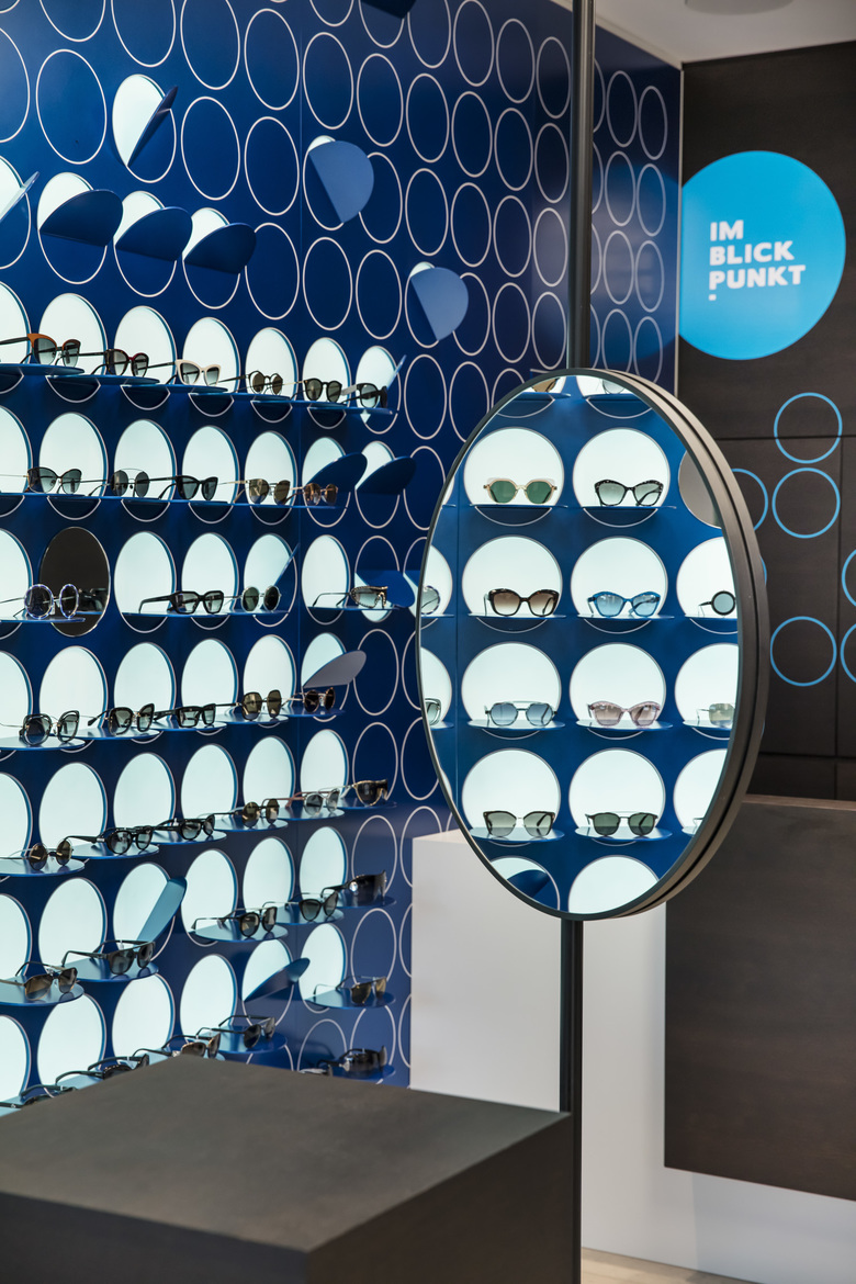 Gestalterisch steht der Kreis im Blickpunkt. In Anlehnung an das bekannte Logo entstand ein ausgefallenes Raumdesign und ein Präsentationskonzept, welches Korrektions- und Sonnenbrillen perfekt inszeniert. Direkt im Eingangsbereich entdecken die Kunden die sogenannte „Brand-Wall" mit dem umfangreichen Sonnenbrillensortiment des Optikfachgeschäftes. An dieser großen, metallischen Grafikwand steht jede der Brillen im Fokus des Betrachters. Es schließt sich eine farblich harmonierende, sehr transparente Verkaufsfläche an. Blau, Grau und Braun geben den Räumlichkeiten eine gemütliche und zugleich wertige Atmosphäre. Immer wieder tauchen runde Gestaltungselemente auf. Als langfloorige Teppiche an den Beratungsplätzen, in den runden Decken- und Pendelleuchten und in originellen, stylischen, „Spiegelsteelen“. Einladend wirken auch die Sitzmöbel. Zwei Sessel, in filziger Haptik vor einem der mehrfach eingesetzten Raumteiler aus transparentem, bronzierten Glas, ebenso wie die komfortablen Stühle an den kleinen, schlichten Beratungstischen in dunkel gebeizter Eiche.