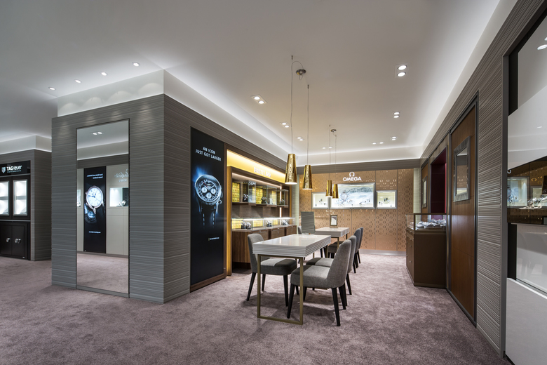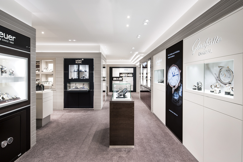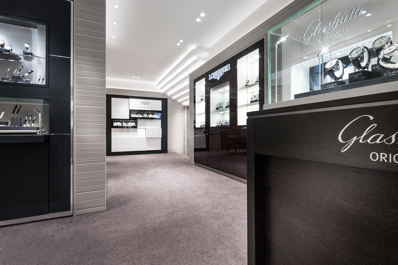 Doch trotz dieser Markenvielfalt zieht sich ein einheitliches Ladendesign durch die komplett neu gestaltete Verkaufsfläche. Sowohl die weißen, hochwertigen Wandvitrinen mit Ledereinfassung als auch die hellen Stelen im Mittelraum, setzen die Schmuckstücke und Uhren brillant in Szene.
