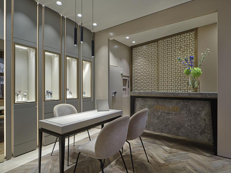 Seit mehr als 90 Jahren befindet sich der exklusive Damen- und Herren-Juwelier für hochwertigen Schmuck sowie exklusive Uhren Am Schlößle 1 im schönen Kempten. Die beiden traditionellen, direkt gegenüberliegenden Ladenlokale sollten in zwei aufwändigen Umbauphasen jeweils einen eindrucksvollen Relaunch erfahren. Sowohl die Tradition des Hauses Müller als auch die Geschichte der denkmalgeschützten Gebäude mussten dabei in das neue Ladendesign durch die HEIKAUS Design Studio einfließen. Die Hochwertigkeit der Produkte sollte auch künftig in den Verkaufsräumen der Gebäude repräsentiert werden. Kundinnen und Kunden sollen eine Inszenierung aller Raumbereiche erleben, die geschmackvoll und exklusiv jede Produktgruppe in Szene setzt und die Räumlichkeiten dabei harmonisch verbindet. Die neue Material- und Farbwelt muss die Kundinnen und Kunden in einer exklusiven „Wohnzimmer-/Bar-Gemütlichkeit“ empfangen, welche durch die Hochwertigkeit des Design-Stils zugleich beeindruckt.