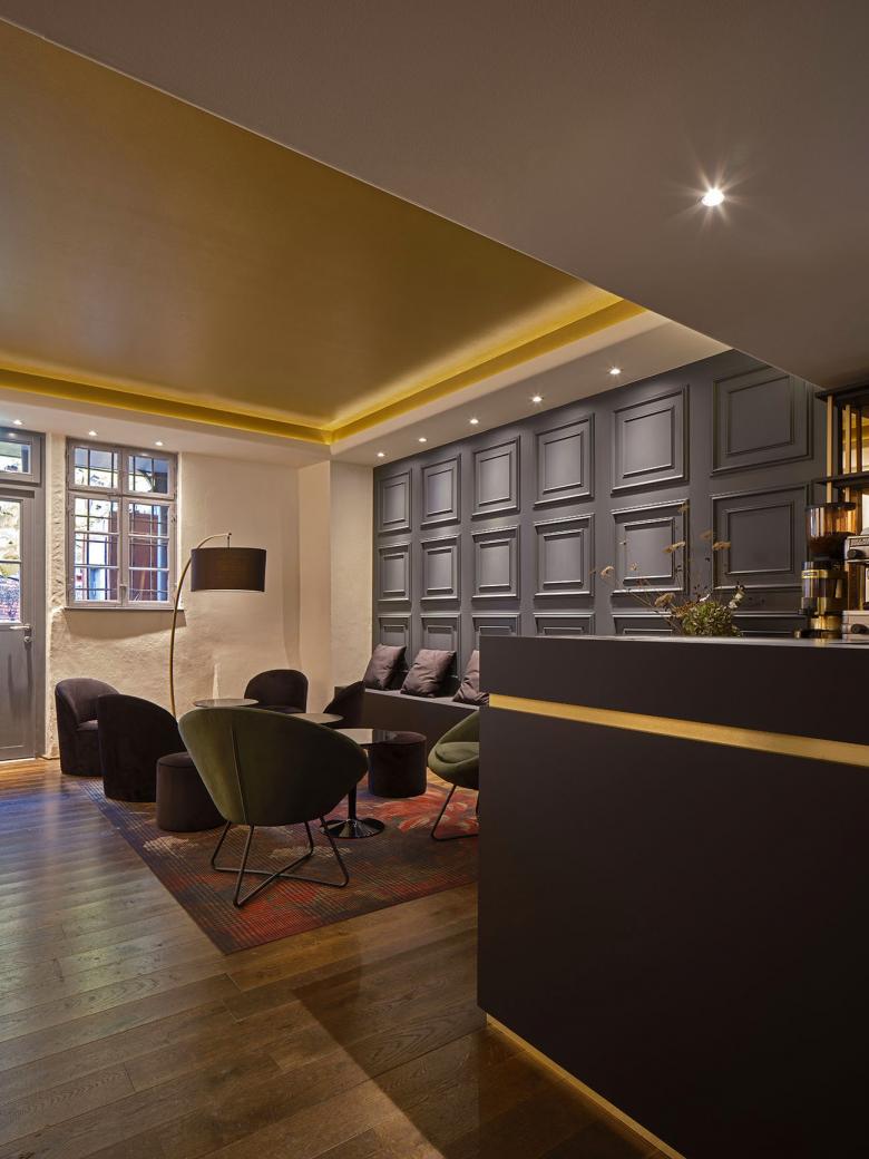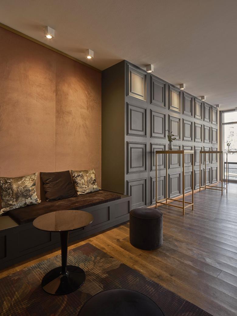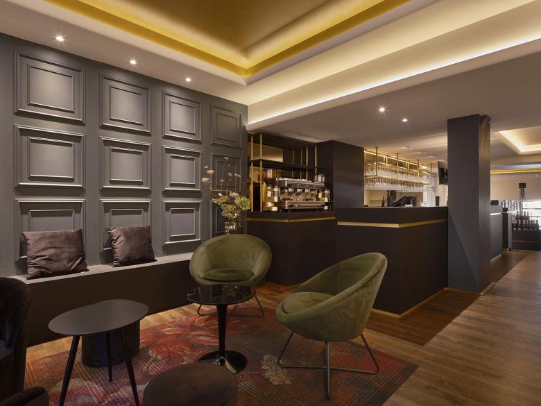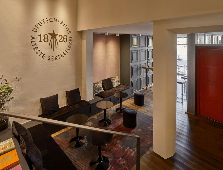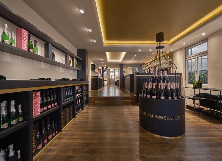 Um die Atmosphäre und Struktur des Raums zu verbessern, wurden drei Deckenfelder mit indirekter Beleuchtung eingebaut, die jeweils eine bestimmte Zone markieren. Diese befinden sich im Lounge-Bereich, im Gang vor der Bar und über dem Bereich der Merchandising-Ware. Die Beleuchtung der Deckenfelder trägt zur Atmosphäre bei, während die restliche Beleuchtung als funktionale Arbeitsbeleuchtung in der Bar und zur Hervorhebung der Sektflaschen in den Wandregalen dient. Ein rosafarbener Stoff im Eingangsbereich nimmt die Verpackungsfarbe des „Kessler Hochgewächs Rose Brut“ auf. Die Treppenstufen wurden zu bequemen Sitzbereichen umgestaltet, und die ursprünglich ungemütlichen Bodenfliesen mit schwarzem Schichtstoff überdeckt. Die „Kassettenwand“, inspiriert von Kessler, greift den historischen Charakter des Gebäudes auf und ist in Flaschengrün gehalten. Die Hauptfarbtöne Messing, Grün, Schwarz und Rosa prägen das Farbkonzept. In den Loungebereichen wurden zusätzlich Teppiche verlegt, die die Atmosphäre der Stuttgarter Bar aufgreifen und gleichzeitig das neue Wanddesign ergänzen.